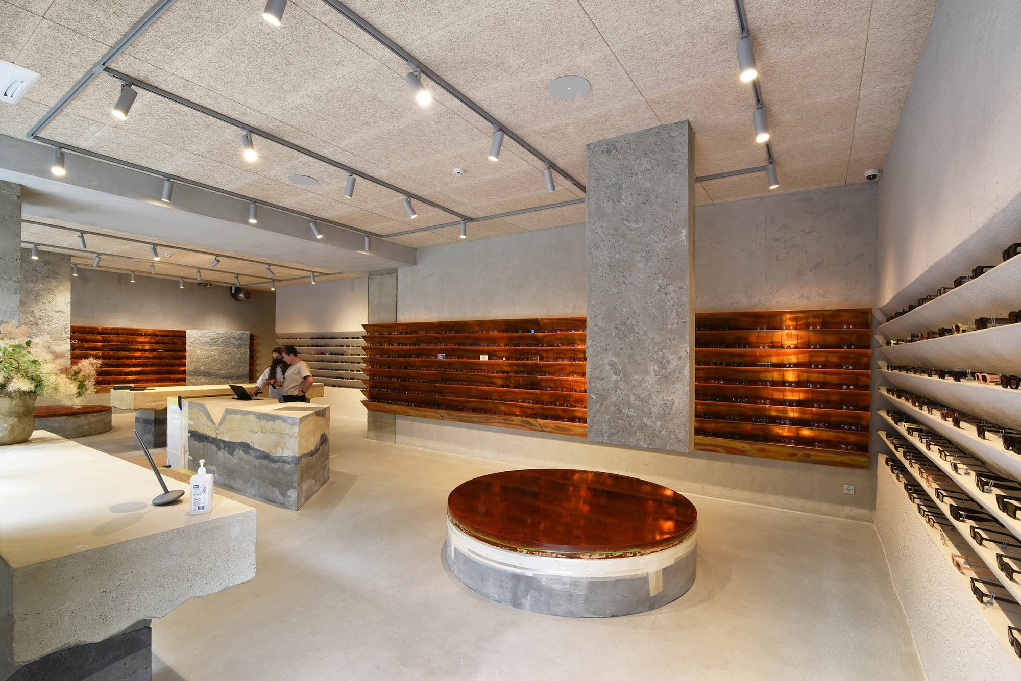 Klasické sádrokartony, bílé stěny nahradil ani kazetové podhledy zde nenajdete. Interiéru vévodí surové betonové bloky, pohledové betonové stěrky a akustický strop z desek z dřevního vlákna a cementu. Šedý základ doplňují jako akcent měděné prvky. Celý koncept působí moderně a minimalisticky.