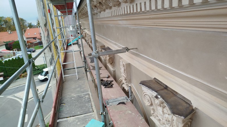 „Samotné přestavbě předcházela projektová příprava, která trvala cirka půl roku a musela se vypořádat s tradičními složitostmi všech rekonstrukcí, a to neznalostí původně použitých materiálů a konstrukčních návazností. Přes podrobný stavebně technický průzkum, který mimo jiné odhalil původní kamennou podlahu v hloubce téměř metr pod stávající podlahou, torza původních kleneb průchodů, ornamentní prvky původního stropu sálu i zdobnou výmalbu, jsme se během stavby museli vypořádat se spoustou technických komplikací. Jednou z nejtěžších částí bylo dočasné zajištění objektu proti zatečení během realizace, dočasné statické zajištěné stěn před betonáží stropu, a především změna pozice a tvaru schodiště do podkroví z důvodu zjištěné kolize se sousedním objektem,“ upřesnil projektant a technický dozor celé stavby Ing. Jiří Hořínek a dodal: „Velkou výzvou bylo provedení samotné konstrukce krovu, která se snaží co nejvíce přiblížit původnímu tvarosloví, a především provedení ornamentní fasády na základě historických pohlednic a fotografií.“ Vše je dokresleno spojením moderních technologií a materiálů tak, aby stavba byla funkční a uživatelsky příjemná.
