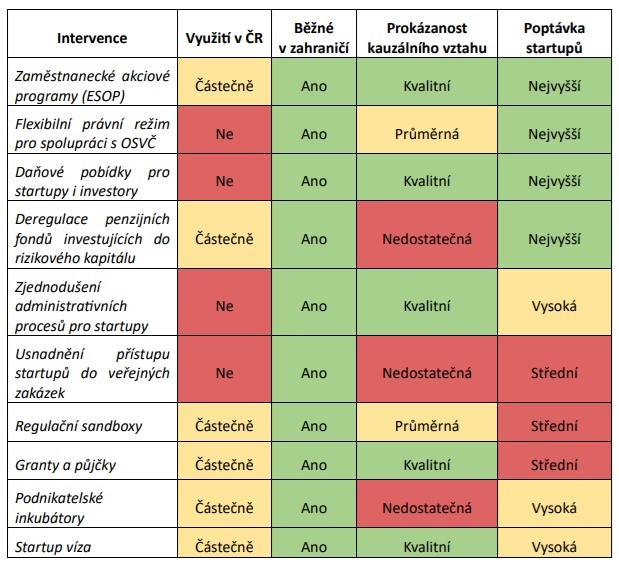 Přehled všech zvažovaných intervencí je uveden v Tabulce 1. Tabulka obsahuje informace o jejich využití v ČR a v zahraničí, dostupné vědecké evidenci a poptávce ze strany startupů dle hodnocení České startupové asociace. Data v této tabulce identifikují intervence, které mohou mít pozitivní dopad. V této fázi však na jejich základě ještě nelze doporučit žádná konkrétní opatření k realizaci, jelikož se tato studie zatím nezabývá jejich nákladovou efektivností nebo riziky. Posouzení těchto aspektů bude nezbytnou součástí navazující komplexní dopadové analýzy (tzv. hodnocení RIA).