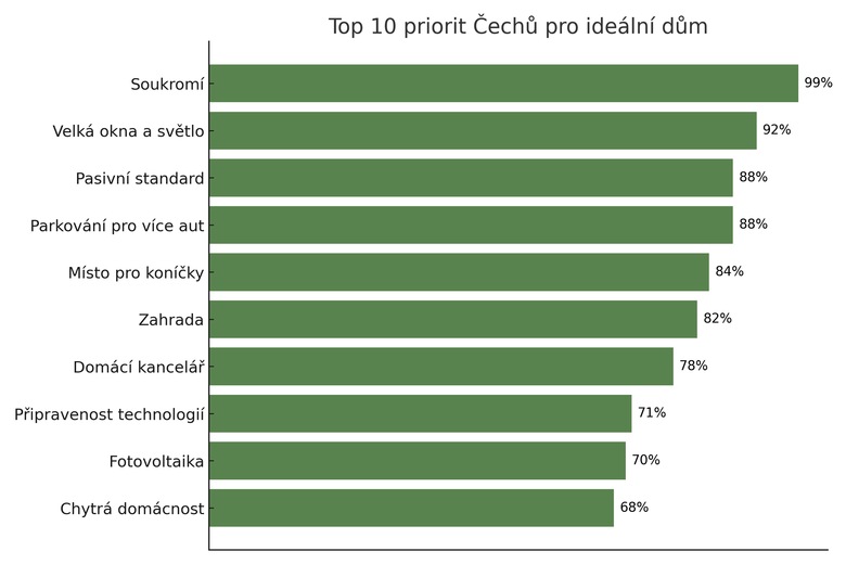 Češi mají jasno: ideální dům musí především nabídnout soukromí, to je klíčové pro 99 % lidí. Pro 92 % Čechů je samozřejmost mít velká okna s dostatkem denního světla. Místo pro více než jedno auto chce 88 % lidí. Stejně důležité je pro ně i to, aby dům splňoval pasivní standard a disponoval energeticky úsporným řešením. Preference bungalovu a patrového domu jsou vyrovnané, 82 % respondentů si ho ale nedokáže představit bez velké zahrady. Vyplývá to z aktuálního průzkumu agentury Ipsos, který si nechala zpracovat společnost wienerberger.