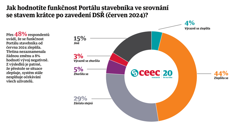 Stav digitalizace stavebního řízení se v posledním roce zlepšil. Téměř polovina (48 %) zástupců měst, obcí, krajů a stavebních úřadů uvádí, že Portál stavebníka je oproti loňsku funkčnější. Přesto většina úřadů však upozorňuje, že systém stále běží s obtížemi. Vyplývá to z aktuálního průzkumu CEEC Research, kterého se na přelomu září a října zúčastnilo 631 respondentů z celé republiky.