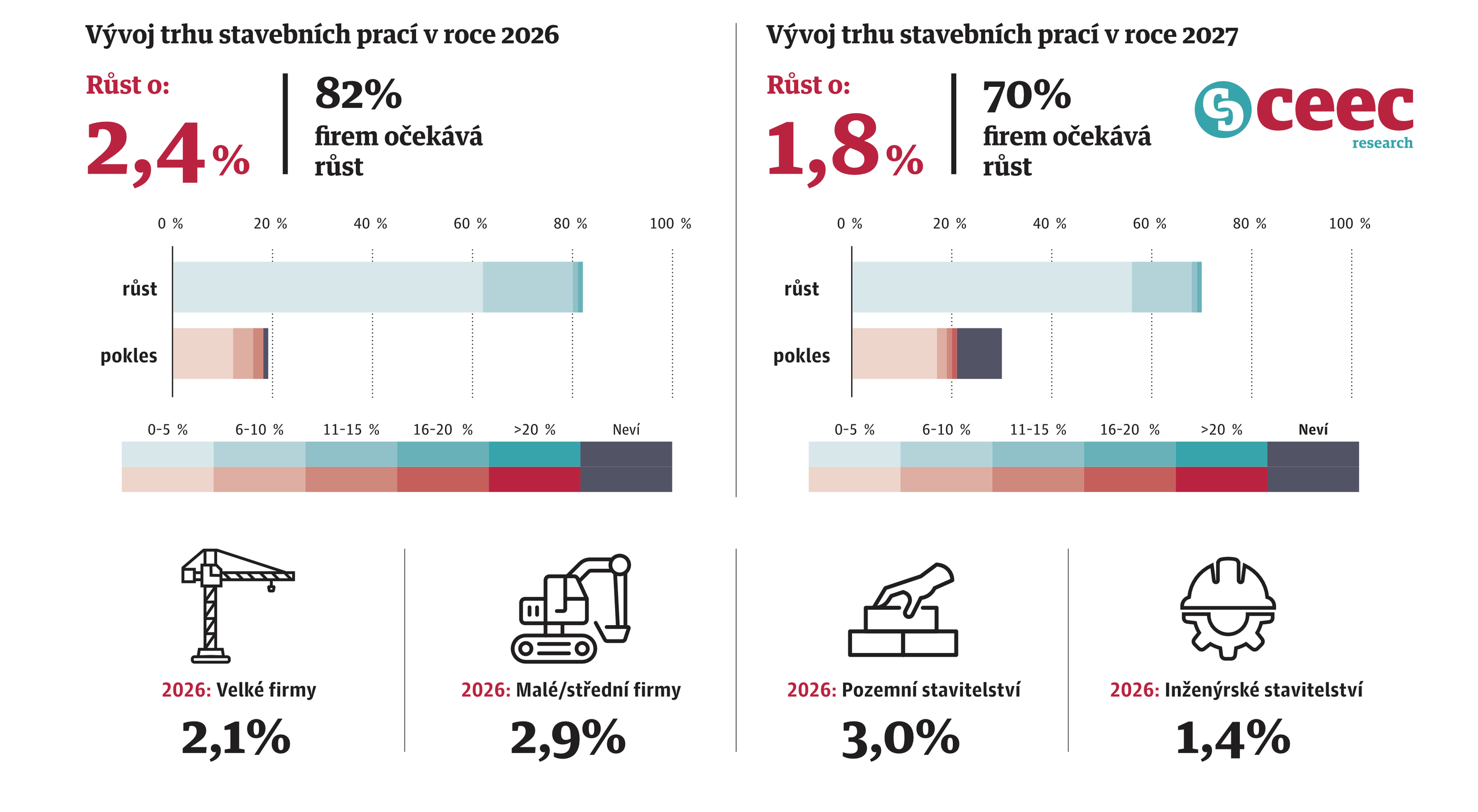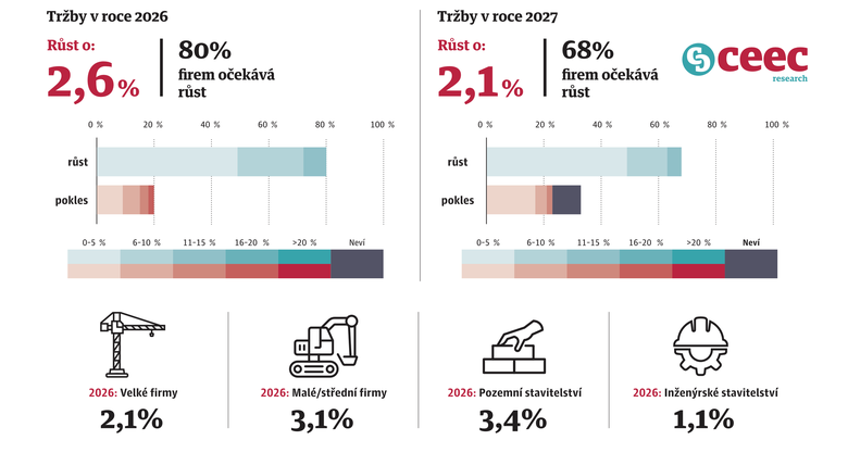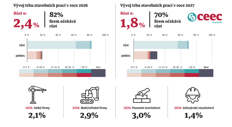 - Růst trhu stavebních prací: 2026 +2,4 %, 2027 +1,8 %.