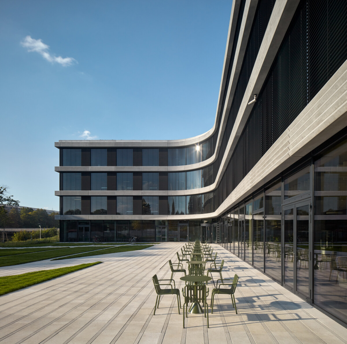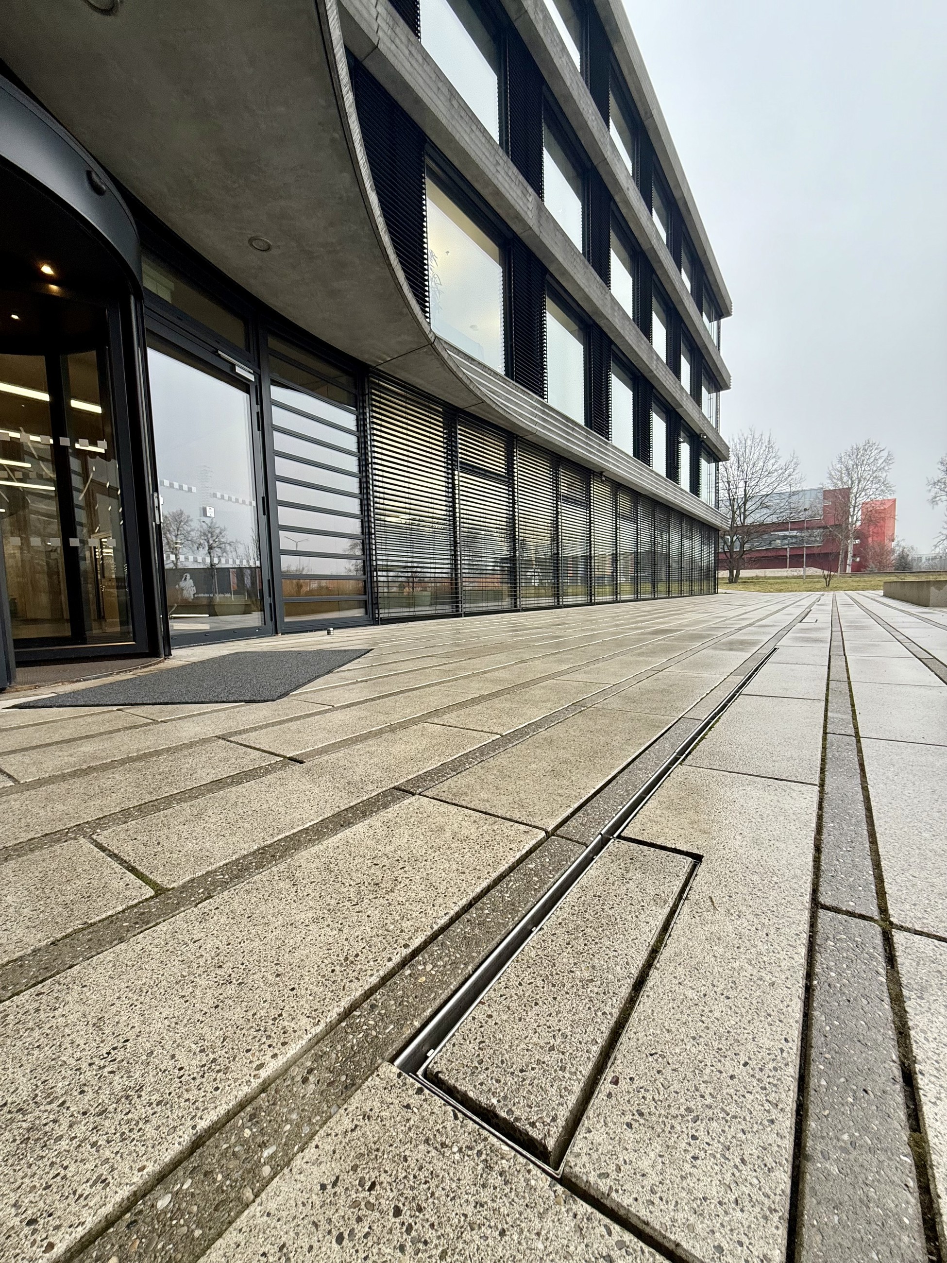 Kombinací těchto řešení vznikl u nové budovy technicky spolehlivý odvodňovací systém, který je i vizuálně sladěný s architekturou celého areálu.