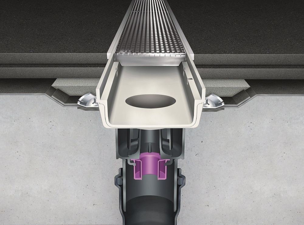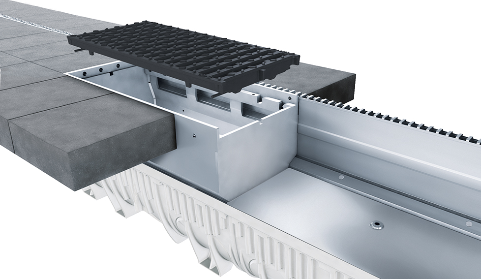 Architektonicky exponované části areálu doplňují diskrétní štěrbinové nerezové žlaby TOPSLOT, které působí velmi čistě a elegantně. Díky úzké nerezové štěrbině na povrchu nijak neruší vzhled okolních ploch, přesto však pod povrchem ukrývají plnohodnotný žlab s dostatečnou kapacitou. Jsou ideální pro pěší zóny, terasy a další místa s vysokými nároky na estetiku.