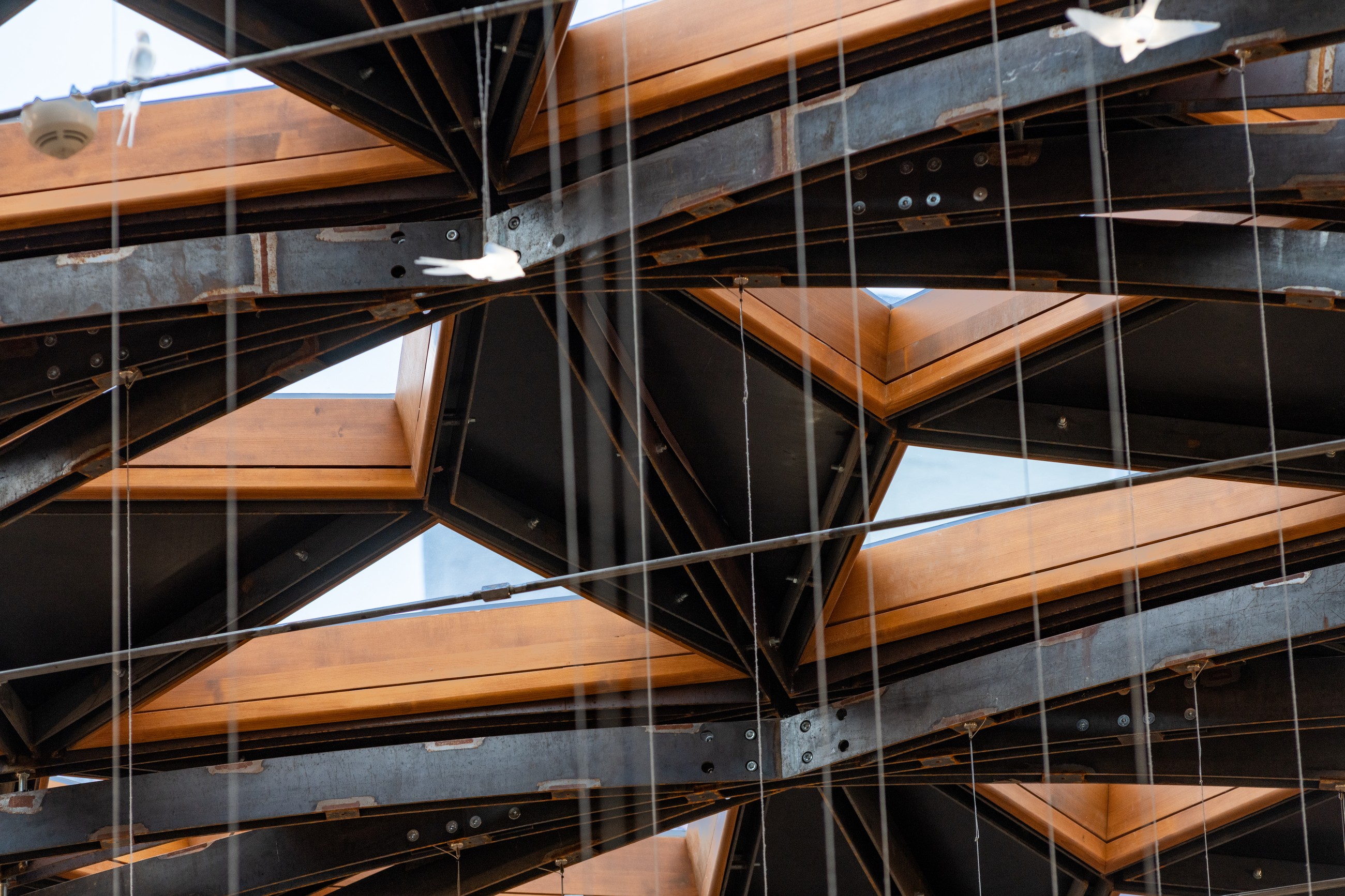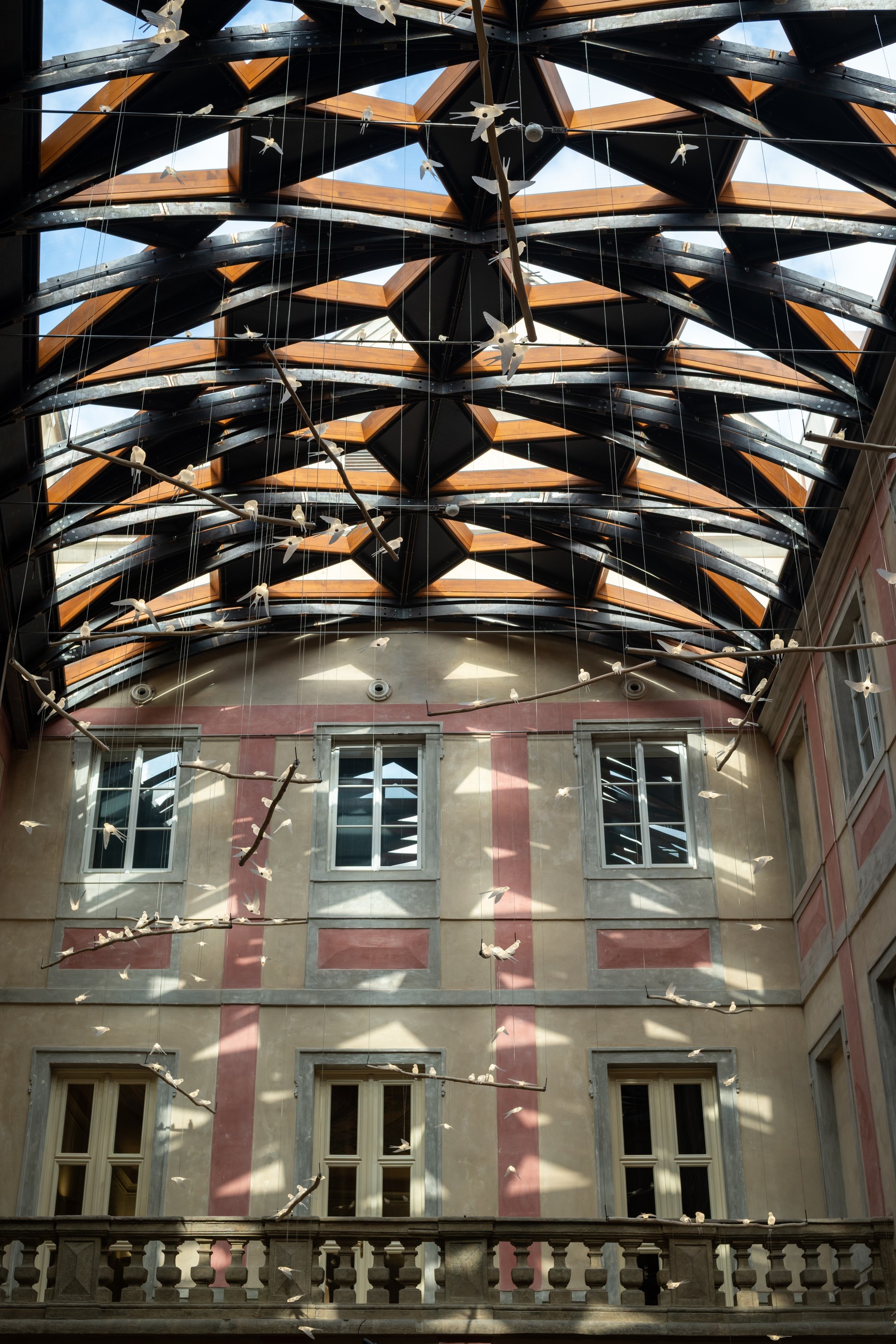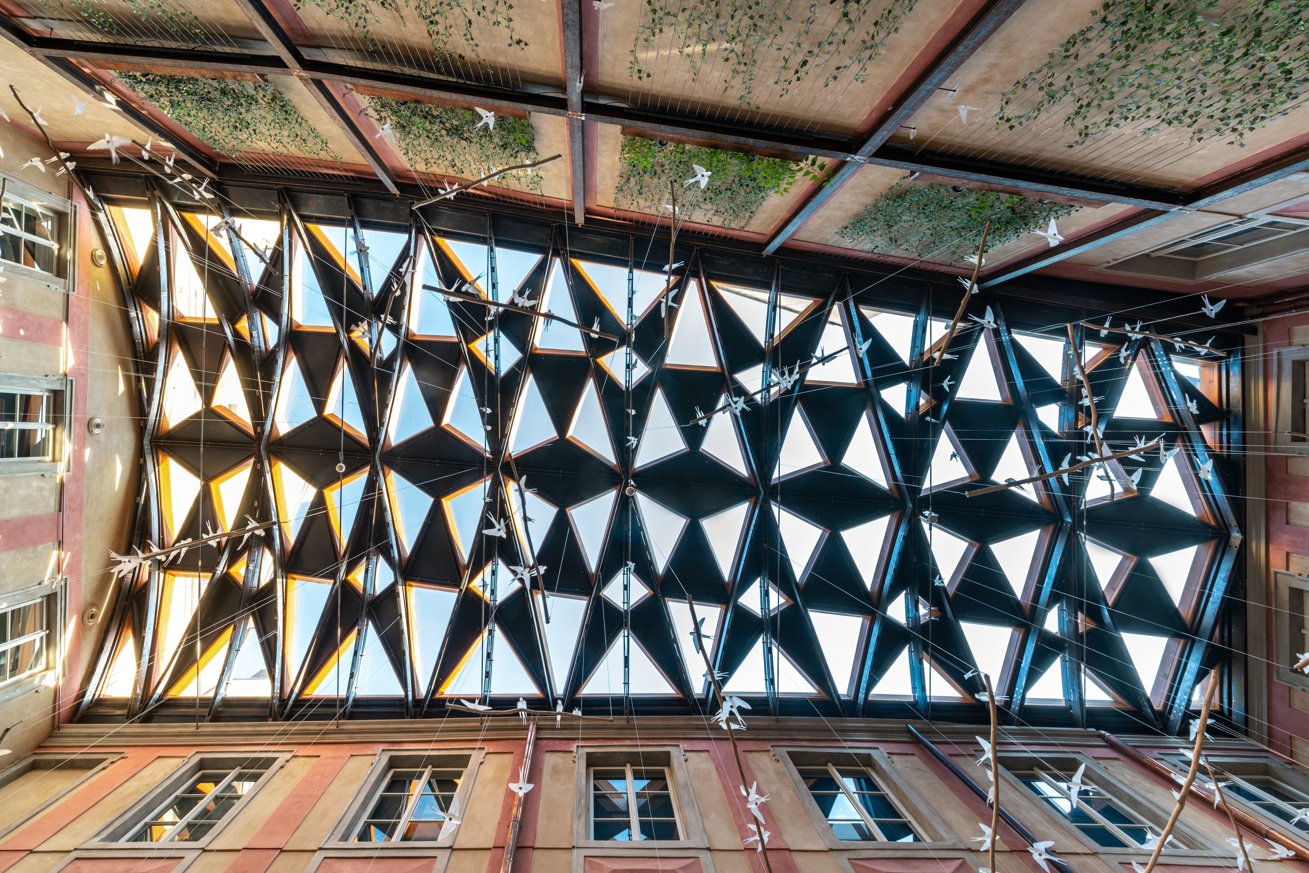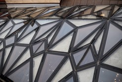 Protože samotná nosná konstrukce představuje poměrně velké procento neprůhledné plochy, bylo nutné pro prosklené části použít co nejtransparentnější skla. „Bronzové nebo šedé varianty zasklení, které se v případě střešní aplikace běžně používají, by prostor příliš ztmavily,“ vysvětluje Martin Najman. Zvolená izolační dvojskla mají světelnou propustnost přibližně 80 %, solární faktor přes 60 % a součinitel prostupu tepla U = 1,1 W/m²K. Vnější skla jsou tepelně tvrzená a díky tomu velmi mechanicky odolná, například i proti krupobití. Vnitřní sklo je kvůli bezpečnosti návštěvníků lepené, s bezpečnostní fólií. Kdyby totiž přeci jen došlo k destrukci zasklení, ulpí střepy na bezpečnostní fólii a nepropadnou do dvora.