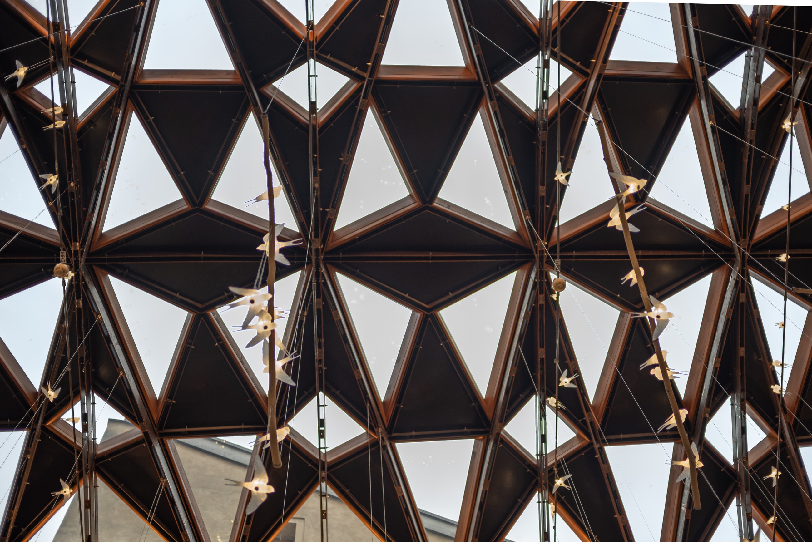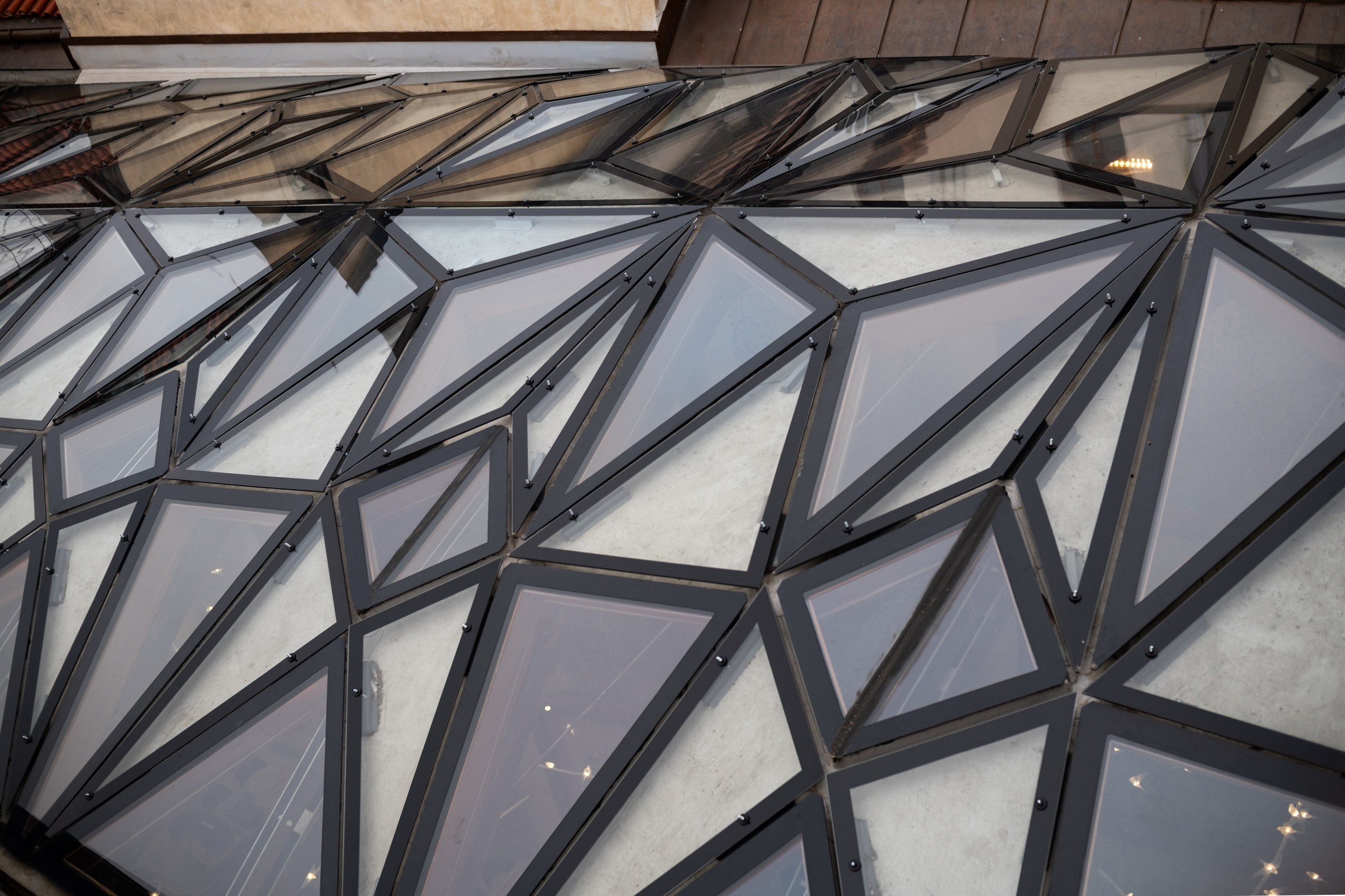 Většina skel je trojúhelníková, některá lichoběžníková – ale ani jeden kus není totožný s jiným. Každý byl vyroben podle přesných šablon a před realizací vznikla řada vzorků o velikosti přibližně metr na metr sloužících k testování styku tří skel. Na nich se ověřovalo, že bude konstrukce fungovat nejen esteticky, ale i technicky – zejména z hlediska odvodu vody.
