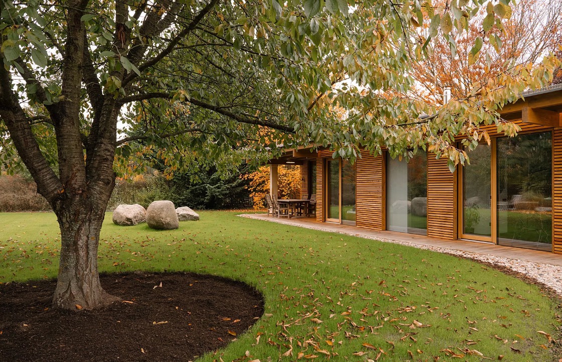 Obrázek 1a: Zdařilým příkladem jednoduché výplňové stavby na pozemku rodinného domu je stavba výměnku, který pro své rodiče navrhnul architekt Vojtěch Malina. Výměnek je bezbariérový a propojený se zahradou. Zdroj: https://vojtechmalina.com/, fotografie: Martin Faltejsek