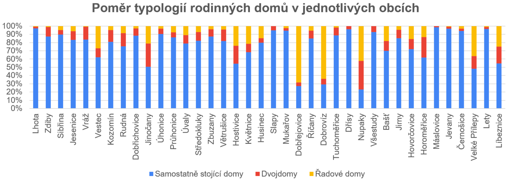 Graf 2: Ačkoliv se typologická struktura v jednotlivých příměstských obcích liší, převaha samostatně stojících rodinných domů je evidentní