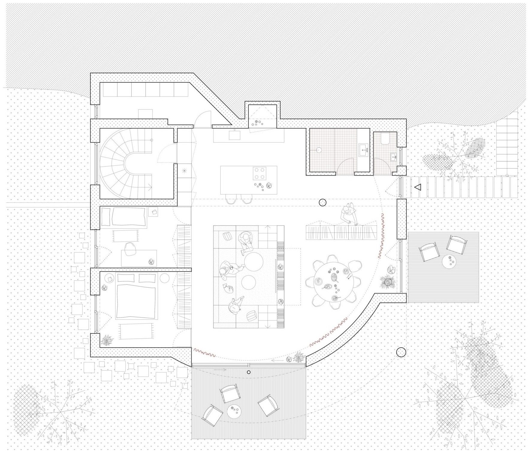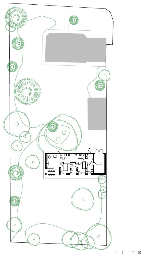 Obrázek 1b: Zdařilým příkladem jednoduché výplňové stavby na pozemku rodinného domu je stavba výměnku, který pro své rodiče navrhnul architekt Vojtěch Malina. Výměnek je bezbariérový a propojený se zahradou. Situační výkres ukazuje umístění a orientaci výměnku vzhledem k původním stavbám na pozemku. Zdroj: https://vojtechmalina.com/