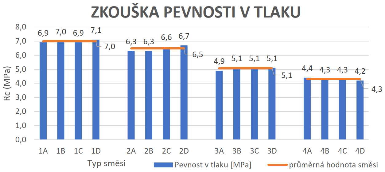 U všech vzorků všech směsí došlo k vyhovujícímu způsobu porušení zkušebních krychlí, proto veškeré výsledky jsou považovány za platné. Pro lepší přehlednost a kvalitnější analýzu byl vyhotoven graf s výsledky zkoušky pevnosti v tlaku.
