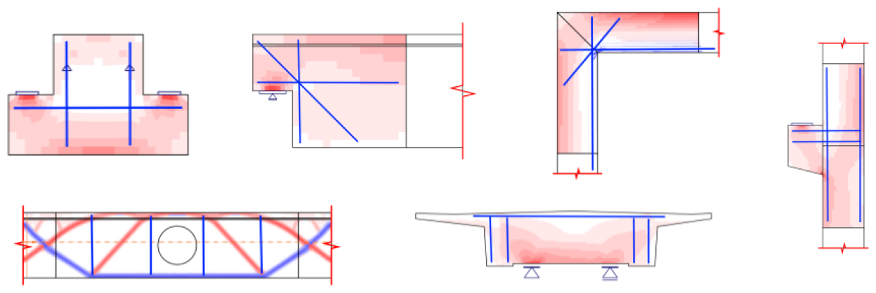 Většina stavebních inženýrů, zabývajících se betonovými konstrukcemi, se během své projekční praxe setká s návrhem oblastí diskontinuit (D-oblastí), viz Obr. 1, tedy oblastí, kde neplatí Bernoulli-Navierova hypotéza o zachování rovinnosti průřezu. Jedná se o oblasti, ve kterých působí soustředěné zatížení, dochází k náhlé změně průřezu, rámové rohy, krátké konzoly apod. V mostním stavitelství jsou to pak např. hlavy pilířů, nadpodporové příčníky, deviátory atd. Při návrhu má inženýr několik možností, jak tyto oblasti posoudit a navrhnout jejich dostatečné vyztužení. Jedním ze způsobu je řešení pomocí příhradové analogie (dále SaT), která je uvedena v aktuálně platných návrhových normách. Použití metody SaT však vyžaduje poměrně značné zkušenosti s tvorbou správného příhradového modelu. Dalším způsobem může být použití softwaru určeného pro řešení 2D/3D prostorových úloh, který usnadňuje návrh a pomáhá pochopit chování konstrukce v nespojitých oblastech.