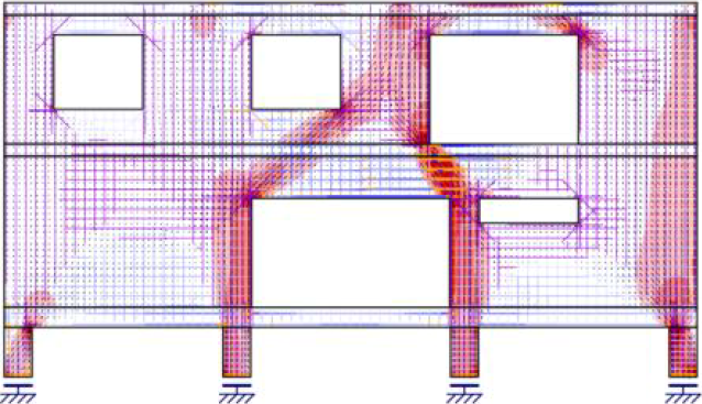 Provede-li se tato analýza napjatosti pomocí CSFM spojitě po celé řešené 2D oblasti, je výsledkem spojité tlakové pole a tlaková a tahová napětí ve výztuži. Zjednodušená grafická reprezentace CSFM napěťového pole např. pro stěnu s otvory nebo zhlaví pilíře je uvedena na Obr. 3.