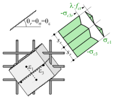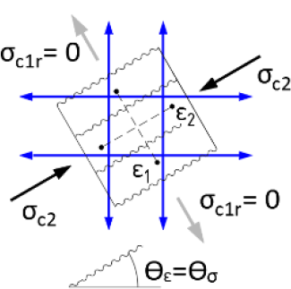 Na obr. 2c je pak zobrazena napjatost stejného elementu analyzovaného pomocí CSFM. Ve směru hlavních tlakových napětí σ2 působí tlačený beton a vznikne tlakové pole s napětím σc2. V případě tahových napětí se vychází ze základního a bezpečného předpokladu norem, že beton v tahu nepůsobí, proto příčná hlavní tahová napětí σ1 beton nepřenese a kolmo na jejich směr vznikne trhlina. Pro přenos tahových napětí tedy musí být součástí modelu výztuž, která veškeré tahy přenese (naznačena modře na obr. 2c).