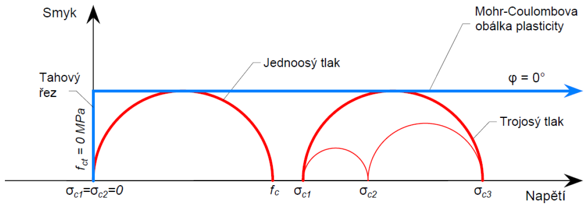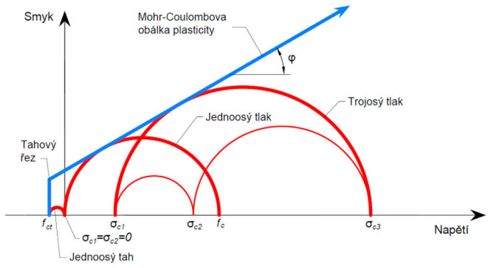 V obecném tvaru lze pro daný úhel vnitřního tření betonu, vykreslit Mohrovy kružnice pro beton do známého obrázku (viz Obr. 5 vlevo). Modrá přímka představuje tzv. obálku plasticity a vymezuje oblast plasticky přípustných kombinací normálového a smykového napětí. Pokud leží celá Mohrova kružnice uvnitř přípustné oblasti, je materiál v pružném stavu.