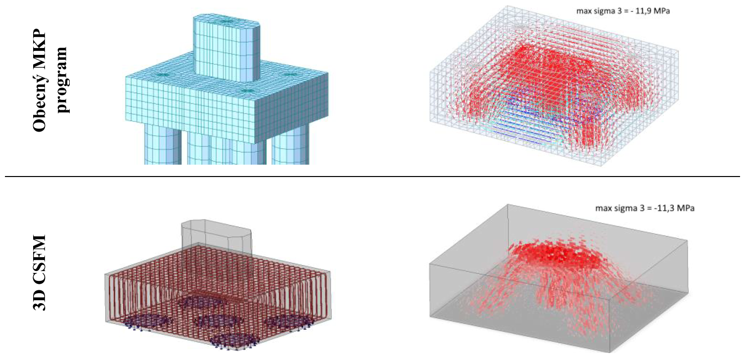 Na následujících obrázcích je zobrazen tok hlavních napětí v základu pro pilotové založení stanovené na prostorovém modelu v obecném MKP softwaru (izotropní materiál betonu, bez výztuže, lineární výpočet) s napětím stanoveným pomocí metody 3D CSFM (beton v tahu nepůsobí, výztuž, MNA). Hlava pilíře zde zatížena pouze tlakovou silou. V případě obecné MKP jsou v průběhu hlavních napětí patrná tahová napětí v betonu, která v modelu při použití metody 3D CSFM chybí (beton v tahu nepůsobí) a jsou zachycena výztuží. Dosažené hodnoty max. hlavních tlaků jsou v obou modelech srovnatelné.