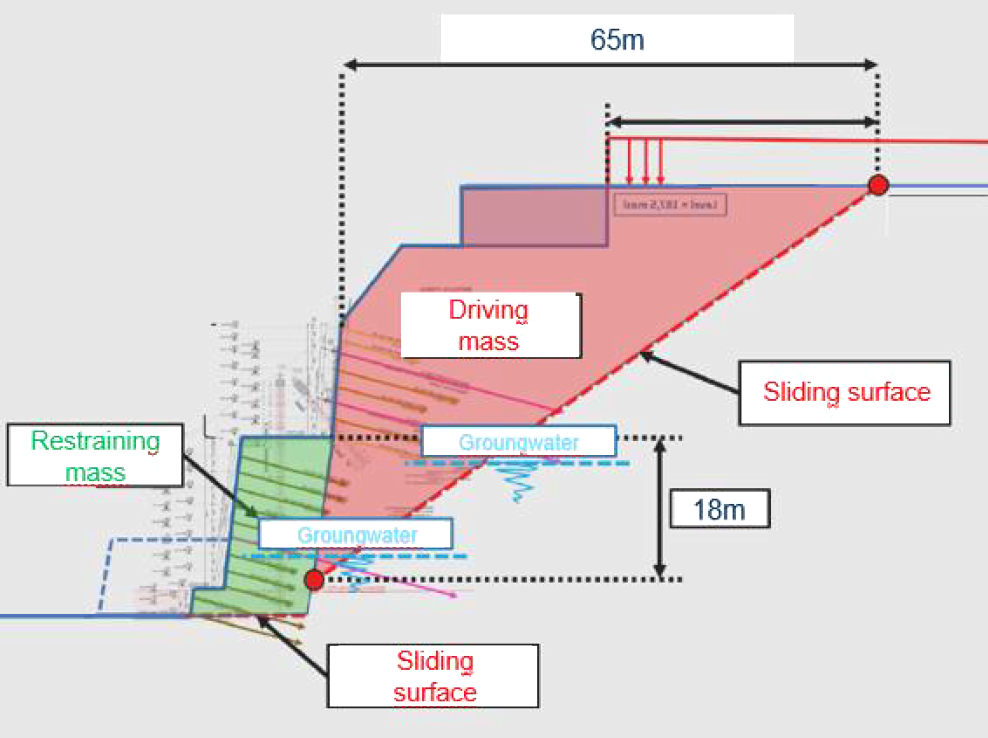 Na základe parametrov horninového prostredia a zadanej geometrie zárezu boli realizované výpočty, a pre každý rez navrhnuté kotevné prvky a k nim prislúchajúce kotevné sily. Výpočty boli realizované vo viacerých programoch, tak aby čo najlepšie vystihovali skutočné podmienky na stavbe. Sústava kotevných prvkov spolu vytvára vystuženie podložia, ktoré pôsobí ako gravitačný múr značnej hrúbky (obr. 1), a zabezpečuje stabilitu zárezu.