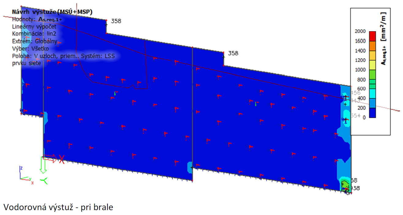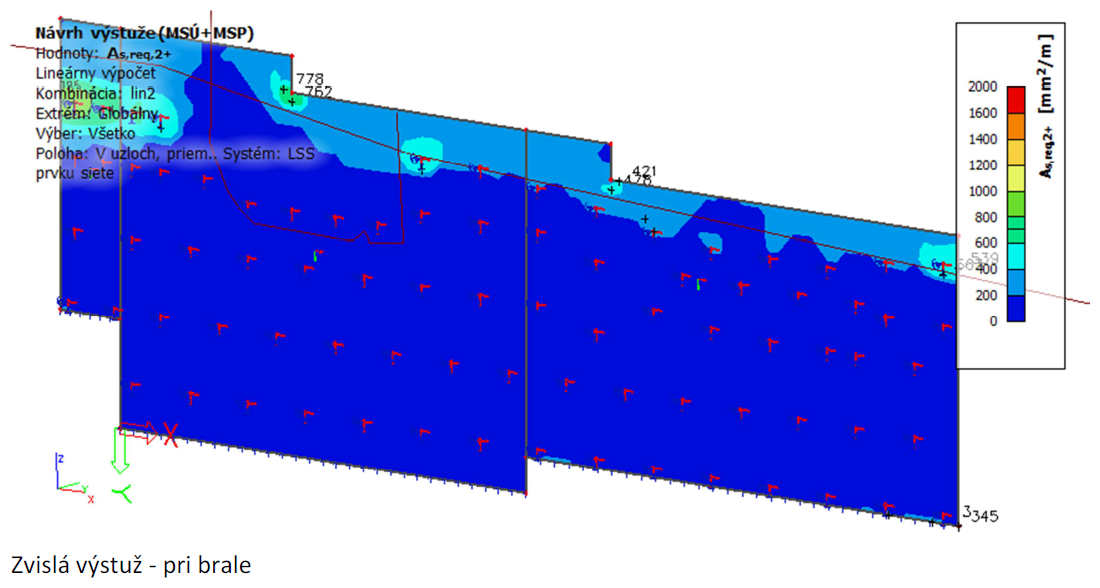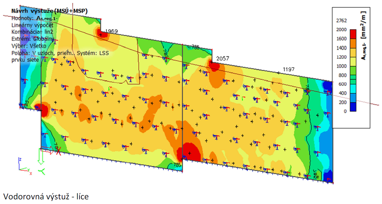 Obr. 4b – Plochy vodorovnej výstuže fragmentu OM1 reprezentujúce rozhodujúci vplyv rozdielu teplôt – ohriatia líca múru (zdroj audit OM1 – Ing. Martin Seyfert, 05.2021)