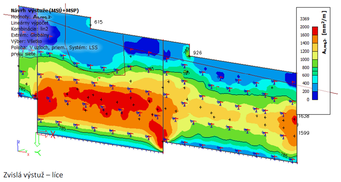 Železobetónová stena bola dimenzovaná z hľadiska únosnosti na charakteristické zaťaženie 50 kN/m2, avšak rozhodujúce plochy výstuže pre túto konštrukciu určila kombinácia s uvážením rozdielu teplôt medzi rubom a lícom 30 stupňov (obr. 4). Keďže horninové klince v rastri 2×2 m výrazne eliminovali ohybové namáhanie žb. steny hrúbky 300 mm, aj pri zaťažení 50 kN/m2 neboli potrebné plochy výstuže také veľké, ako potrebná plocha výstuže vyplývajúca z rozdielu teplôt.