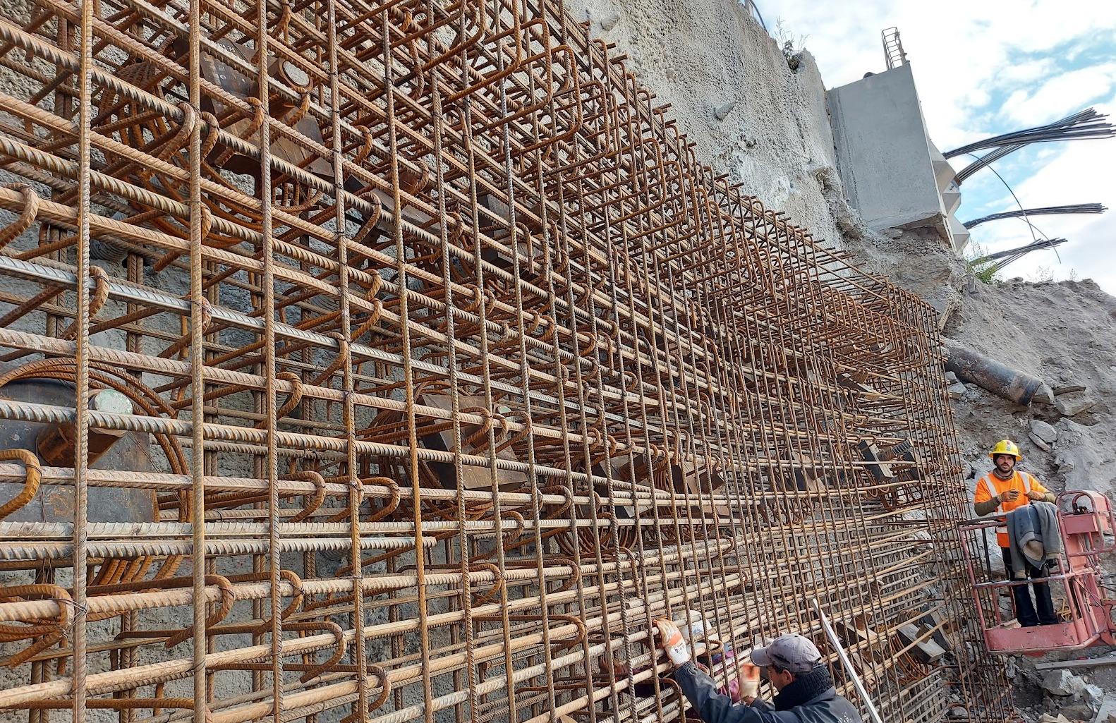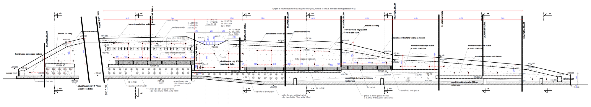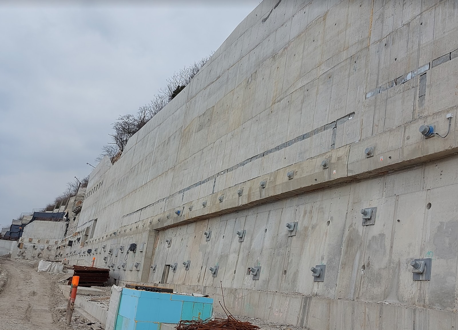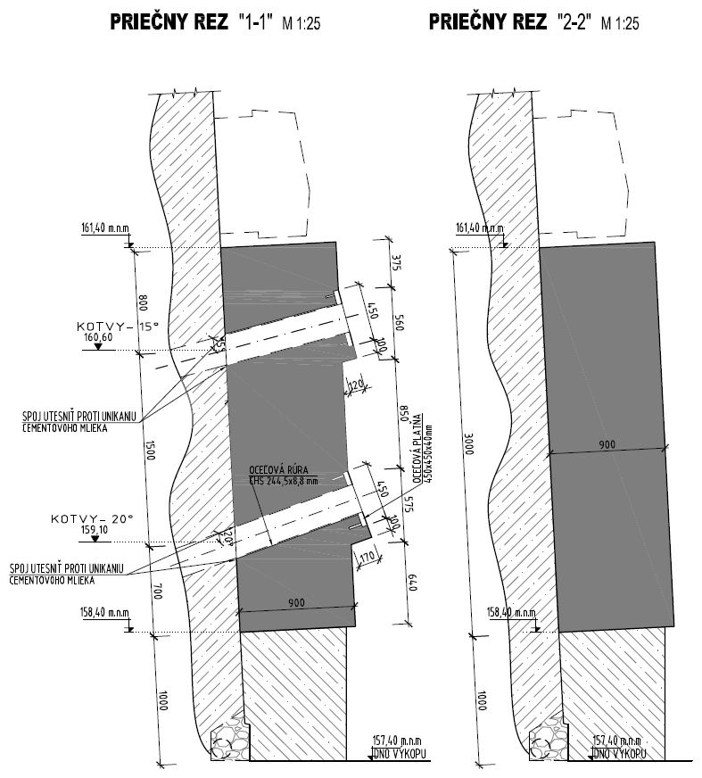 Jedná sa o najkomplexnejšiu konštrukciu v rámci celej I. etapy. Po odťažení zárezu výšky cca 16 m na dĺžke max 170 bm, ktorý bol dočasne zabezpečený torkrétom, sa realizovala na celej tejto ploche žb. stena hrúbky 300 mm, do ktorej boli zakomponované aj kotevné nosníky (obr. 2, 3). Pre prikotvenie boli navrhnuté horninové klince s tyčovou výstužou ANP SAS 550 priemeru 25–32 mm v rastri 2×2 m, zaintegrované do žb. steny. V potrebných úsekoch boli použité pasívne tyče z vysokopevnostnej ocele typu ANP SAS 950/1050 priemeru 47 mm, s trvalou kotevnou hlavou predsadenou pred žb. stenou.