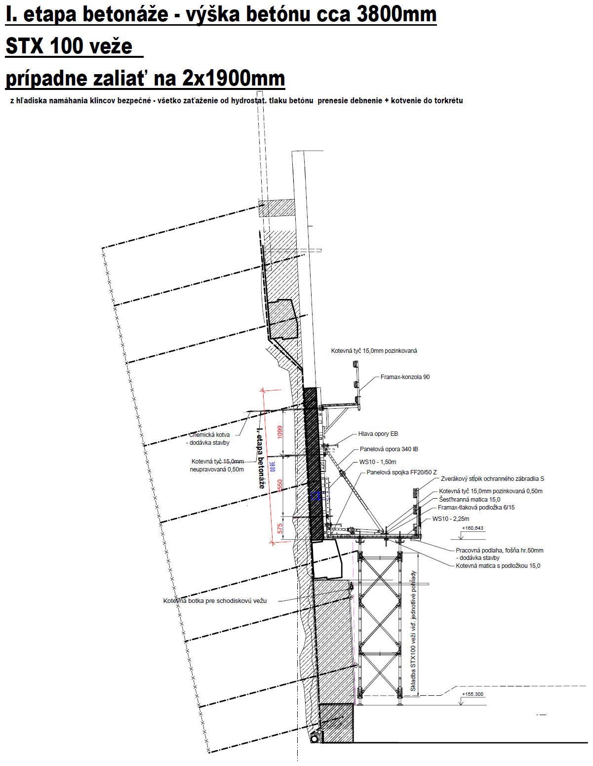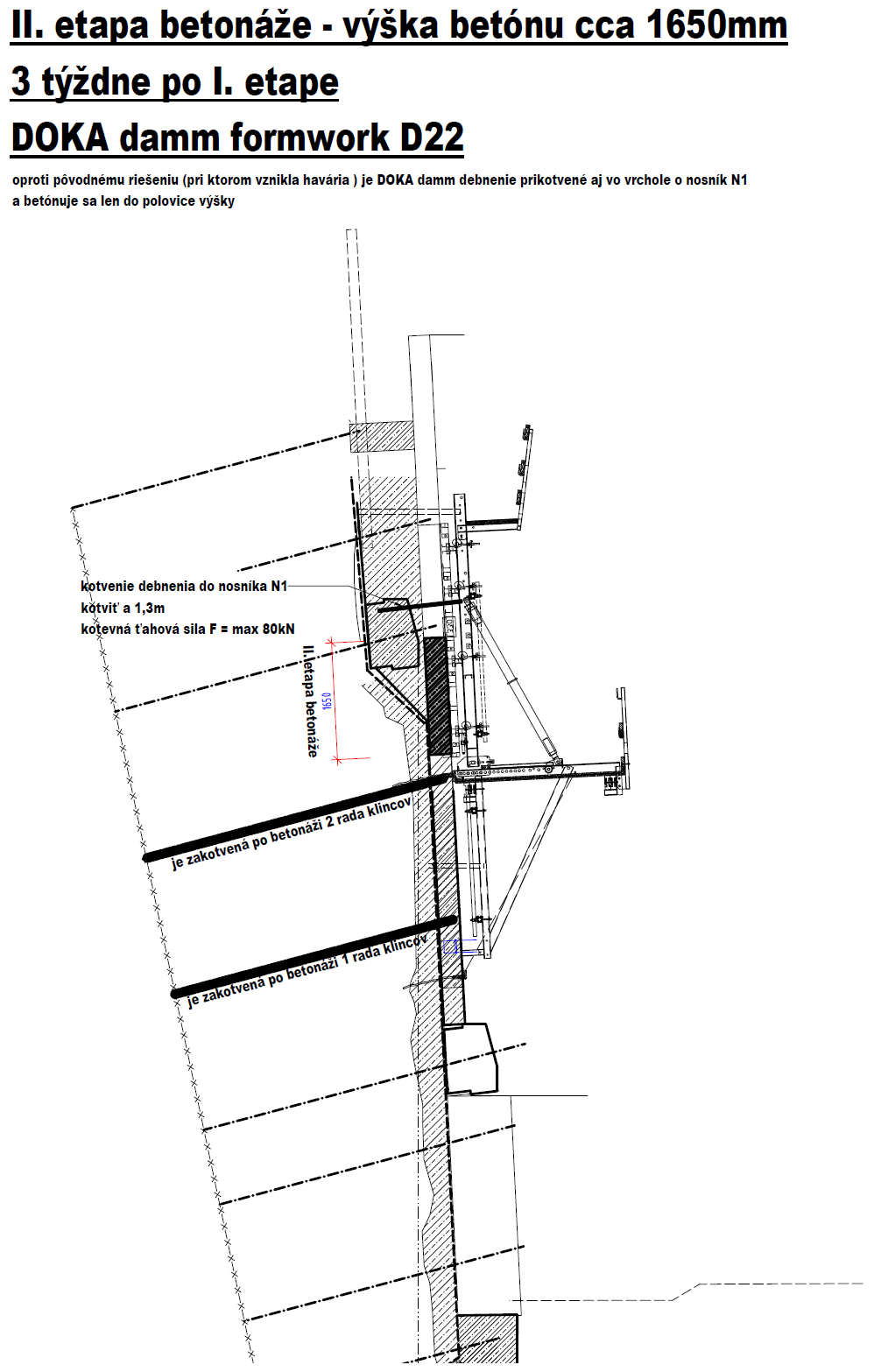 Stena bola realizovaná šplhacím debnením doka DOKA Damm Formwork, ktoré sa vo vyšších častiach kotvilo prihliadnuc k polohám horninových klincov predpísaným technologickým postupom (obr. 6).