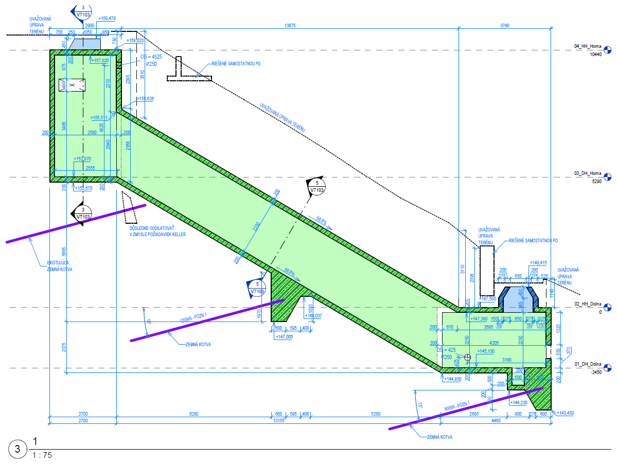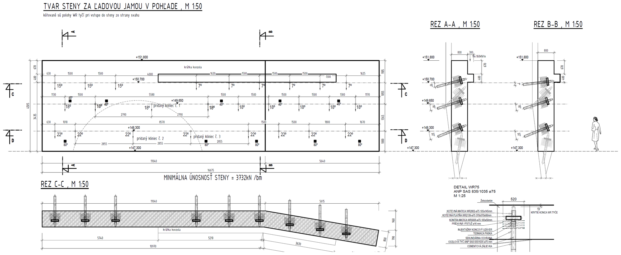 Pôdorysne zalomená žb. stena rozmerov cca 17×4,5 m hrúbky až 800 mm (obr. 7) ukončovala pasívne tyče WR 75 (únosnosť jednej tyče na medzi klzu = 3690 kN, únosnosť na medzi pevnosti = 4572 kN) v rastri cca 1×1,5 m až 1,5×2,5 m. Keďže tyče WR 75 (ANP SAS 835/1035) sú pasívne (nepritláčali stenu predpínacími silami ku svahu) a pod pätou steny pokračoval svah, bolo potrebné tento prvok o celkovej hmotnosti 1500 kN zabezpečiť proti zosunu šikmo vŕtanými mikropilótami (viď rez A-A a B-B na obr. 7). Zabezpečilo sa tak, že celý potenciál kotevných tyčí WR 75 bude využitý na prenos zemného tlaku, a zachytenie potrebných kotevných síl na bm rezu stabilizácie brala. (návrhová hodnota zemného tlaku tu bola 78 kN/m2) a tyče nebudú namáhané prídavným šmykovým namáhaním od prípadného sadnutia steny. Šikmo vŕtané mikropilóty v päte steny zabezpečovali okrem vlastnej tiaže steny aj zvislé prídavné zaťaženie z krátkej konzoly v korune steny. Aj napriek veľkému zaťaženiu konštrukcie bola stena dobre dimenzovateľná na ohyb, jej hrúbku však určilo namáhanie šmykom.