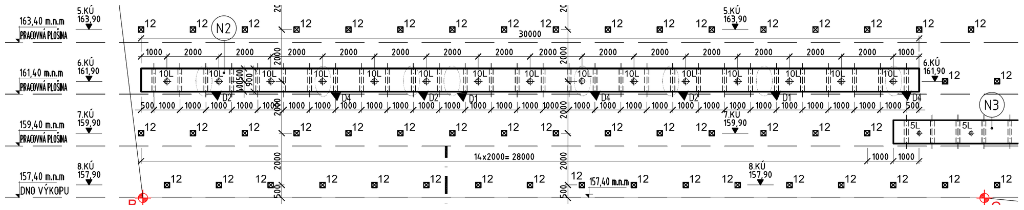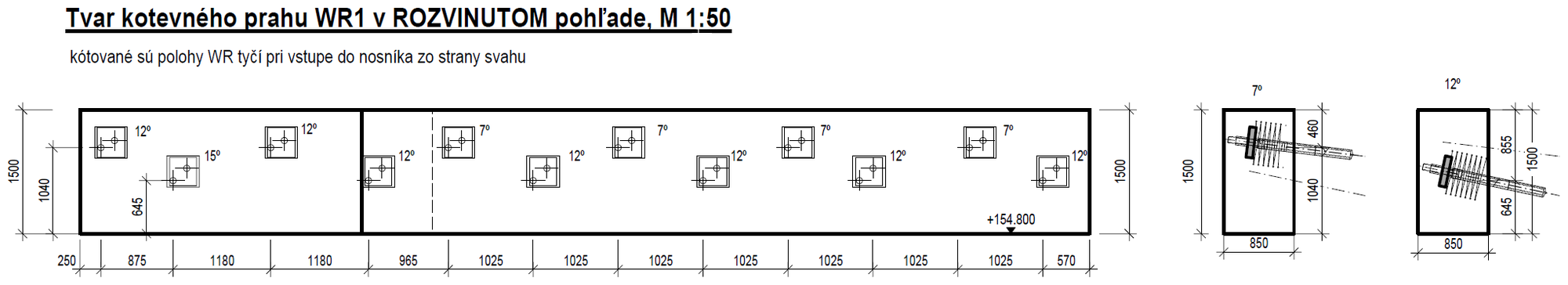 Prútové žb. prvky zabezpečujúce ukončenie kotevných tyčí WR 75, vo vzájomnej osovej vzdialenosti cca 1 m, s rozmerom 850×1500 mm (obr. 9) boli dimenzované jednoducho ako spojité nosníky podopreté v mieste WR tyčí tuhými podperami zaťažené rovnomerným zaťažením (obr. 10) rovnajúcemu sa približne únosnosti tyčí (cca 4300 kN/m). Nosníky boli uložené na teréne na rozdiel od WR4, takže nebolo potrebné riešiť ich podopretie prídavnými prvkami.