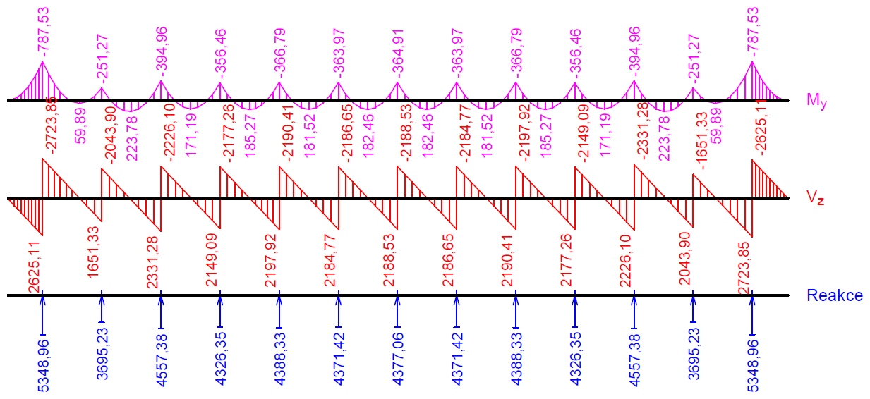 Obr. 10 – Kotevné nosníky počítané jednoducho ako spojité nosníky zaťažené rovnomerným spojitým zaťažením, ktoré sa rovnalo približne únosnosti kotiev