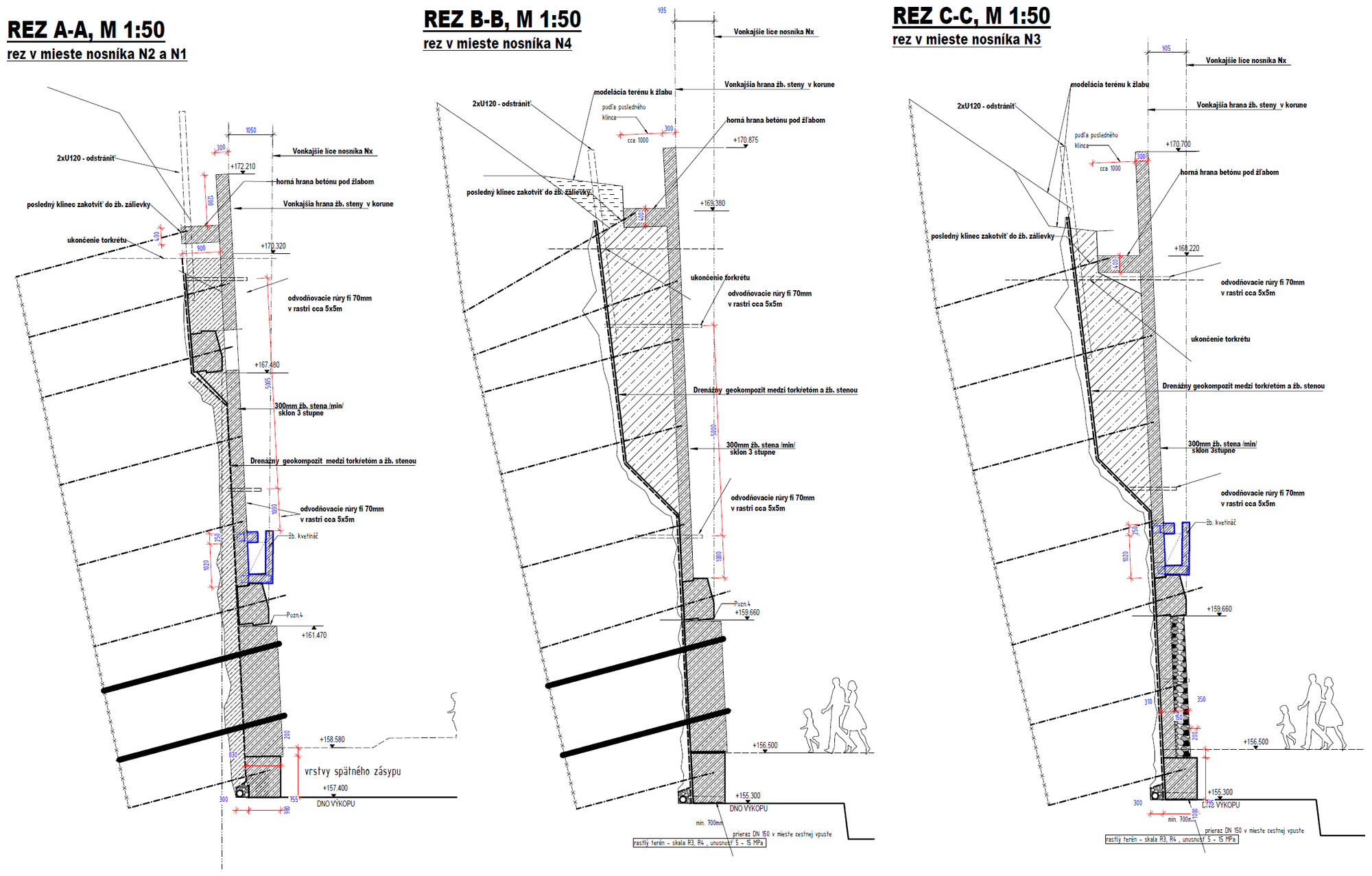 Obr. 3 – Vybrané rezy cez stenu OM1 (okrem horninových klincov v rastre 2×2 m vidieť 10- a 19-lanové nosníky, kvetináče, plošina pre odvodňovací rigol v korune, polohu drenážneho geokompozitu a odvodnenie v päte)