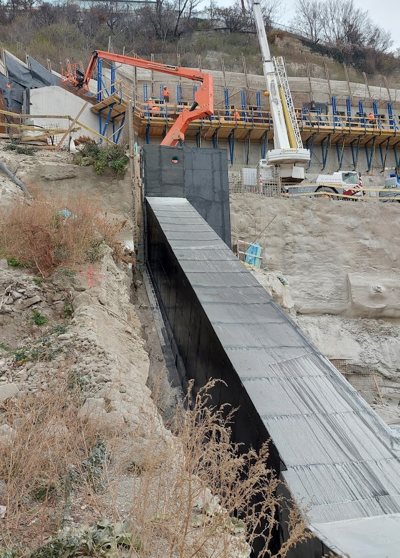 Stena je rozdelená na dilatačné celky, cca 15 bm, ktoré boli zabezpečené proti priesakom vody. Medzi torkrét a stenu bol osadený drenážny geokompozit pre odvod presakujúcej vody do odvodňovacieho potrubia v päte steny (obr. 3). V stene boli realizované po celej ploche aj odvodňovacie otvory fi 70 mm v rastri 5x5 m.