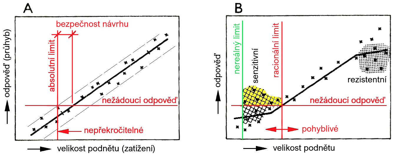 Diagram A popisuje technickou představu o vztahu mezi velikostí podnětu a odpovědí. Takový vztah se vyskytuje u neživých věcí. Příkladem může být přímo úměrná závislost mezi zatížením a průhybem stavební konstrukce. Znázorněním vztahu je stoupající přímka s vyznačeným rozptylem, který vyplývá z výrobních tolerancí. Červená vodorovná čára vyznačuje úroveň nežádoucí odpovědi, tj. průhybu, při kterém konstrukce ztratí svoji funkci. Nejvyšší přípustné zatížení se stanoví na průsečíku stoupající a vodorovné přímky s bezpečností, která musí vzít v úvahu rozptyl vlastností konstrukcí vycházejících z výroby. Jedná se o limit absolutní, který nemůže být nikdy překročen, neboť by hrozilo zřícení konstrukce.