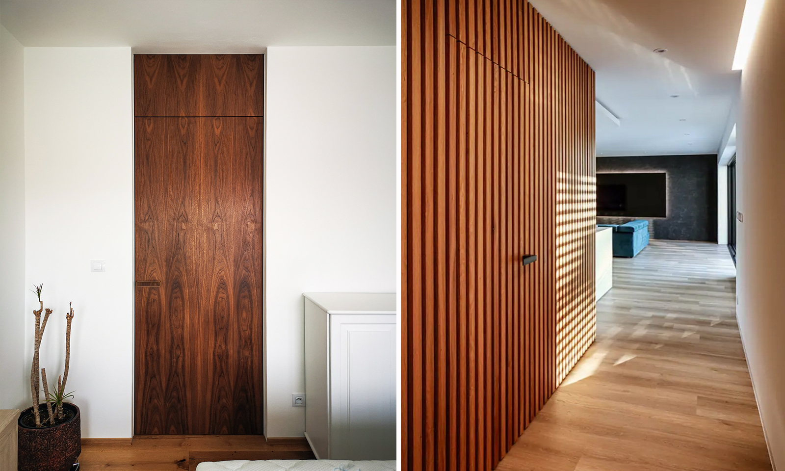 Dveře se skrytou zárubní Dorsis – můžeme vybrat z téměř nekonečné řady možností povrchů a barev – zde například ořech nebo lamelová dubová stěna