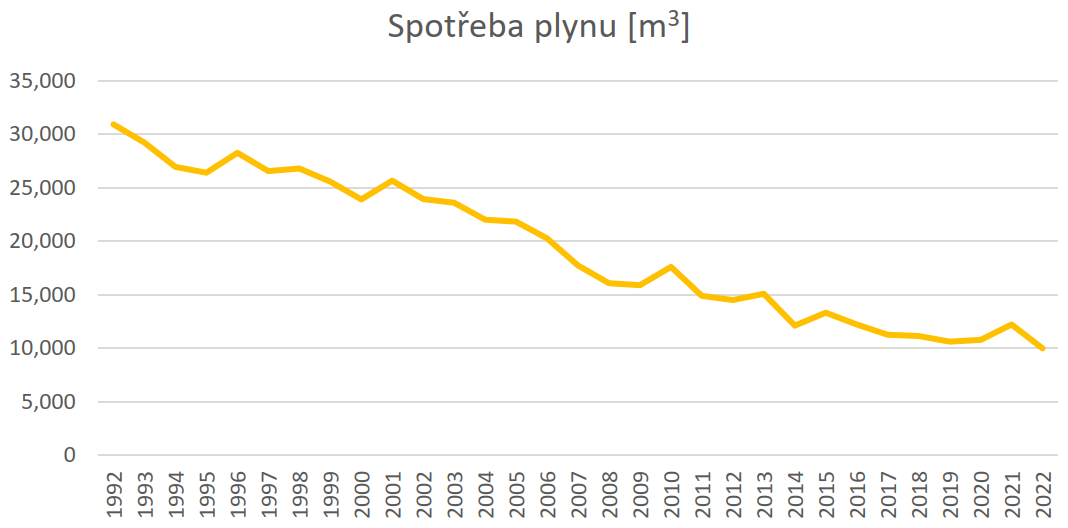 K největšímu snížení spotřeby energii (zemního plynu) vedla postupná regulace otopného systému, zavedení termoventilů do 70 radiátorů a opatření měřičů tepla na jednotlivých radiátorech s dálkovým odečtem. Významně se do snížení spotřeby energie promítla i výměna plynových kotlů v roce 2008 za kotle Viadrus a v roce 2021 za kotle Thermona. Za třicet let provozu plynových kotelen se snížila spotřeba plynu na 38 % původní spotřeby (obr. 7).