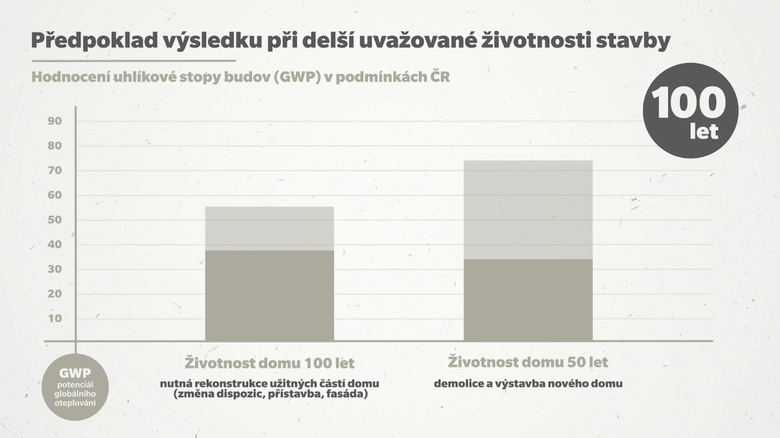 Cílem studie bylo porovnat environmentální dopady různých typů konstrukčních řešení v celém jejich životním cyklu, tedy od vzniku až po likvidaci – „from cradle to grave” v horizontu 50 let. Pouze na základě takto komplexního přístupu je možné vytvořit podklad pro kvalifikované rozhodování. Výsledky ukazují, že rozdíly mezi jednotlivými konstrukčními variantami jsou minimální. Rozdíl v globálním oteplovacím potenciálu (GWP) mezi cihelnou, pórobetonovou a sendvičovou stěnou činí pouhých 2,72 kg CO2 na m2 za rok. Za období 50 let to odpovídá emisím, které vzniknou při cestě automobilem z Prahy do Brna a zpět.