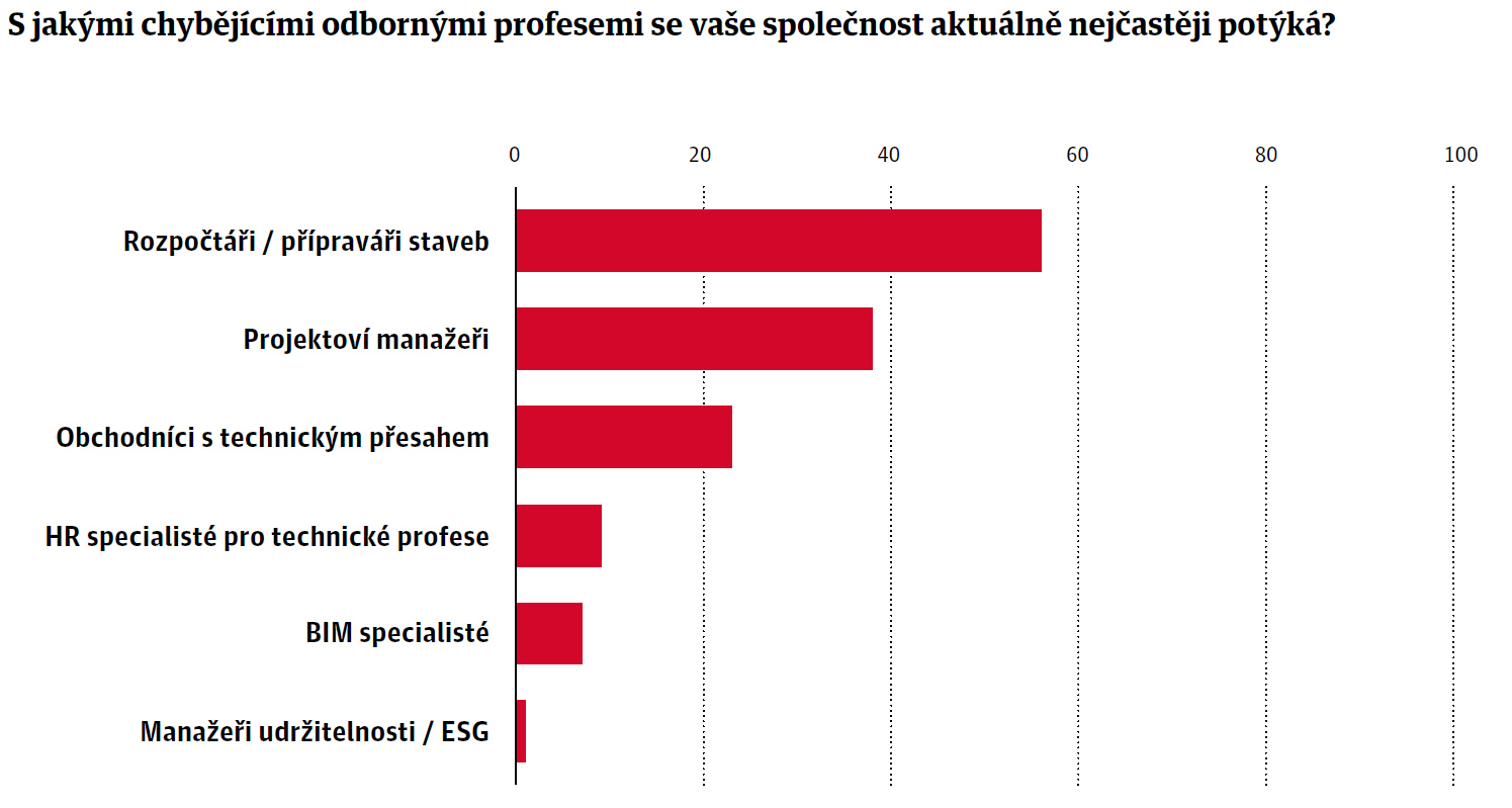 Dle analýzy CEEC Research firmy nejčastěji postrádají zedníky (59 %) a stejně výrazně i tesaře, betonáře a železáře (shodně 42 %). Největší nedostatek mezi odbornými rolemi hlásí stavební firmy u rozpočtářů (56 %) a projektových manažerů (38 %). Uvádějí, že chybějící rozpočtáři komplikují přípravu nabídek a mohou ohrozit správnost cenotvorby i kontrolu marží. Nedostatek projektových manažerů se zase promítá do delších harmonogramů a vyššího počtu kolizí na stavbě. Bez dostatečné koordinace profesí, subdodavatelů a změn během realizace roste riziko zpoždění i dodatečných nákladů.