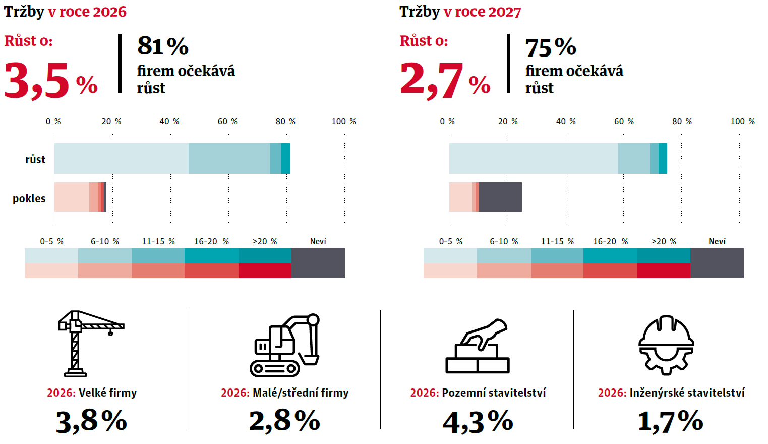 CEEC Research uvádí, že stavební společnosti očekávají, že jejich tržby porostou i v následujících dvou letech – v roce 2026 v průměru o 3,5 % a v roce 2027 o dalších 2,7 %. Tahounem má být zejména pozemní stavitelství, které předpokládá růst tržeb o 4,3 % v roce 2026. Naopak inženýrské stavby čeká pomalejší tempo. Vyplývá to z nejnovější Kvartální analýzy českého stavebnictví společnosti CEEC Research, kterou tvoří odpovědi 160 ředitelů stavebních firem z přelomu října a listopadu minulého roku [8].