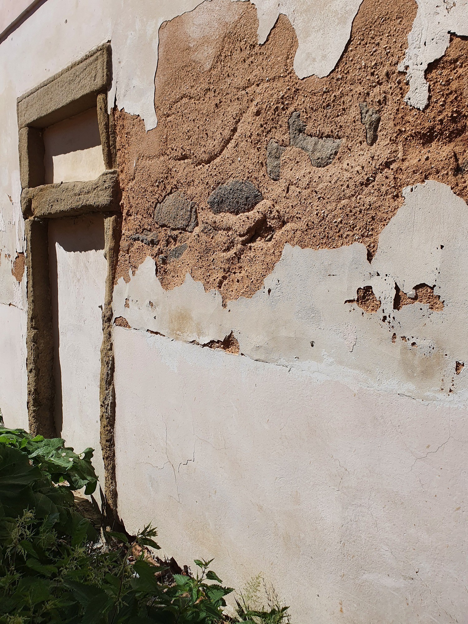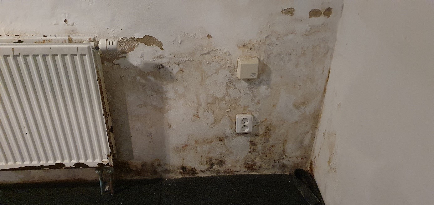 Obr. 5: Pohled na neizolovanou zeď s vážným poškozením. Vpravo zdivo s přizdívkou, bez viditelného poškození.