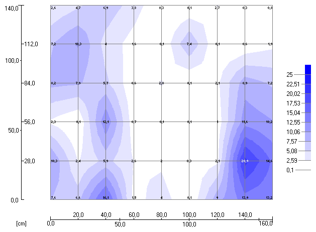 Mikrovlnná měřicí zařízení jsou vybavená elektrodami, vysílajícími více či méně koncentrované svazky mikrovln. Sondy v elektrodě zachycují odražené mikrovlny a odečítají vodou absorbované záření jako přepočet hodnoty vlhkosti v nastaveném měřeném materiálu. Výsledkem je jednak statistika měření, jednak grafická 2D síť s naznačenými tendencemi šíření vlhkosti. Přes líbivé výstupy z měření (izohyety) je patrné, že některé křivky jsou spíše výsledkem osamocených bodů naměřené vysoké hodnoty, než skutečné tendence (viz obr. 1, 2).
