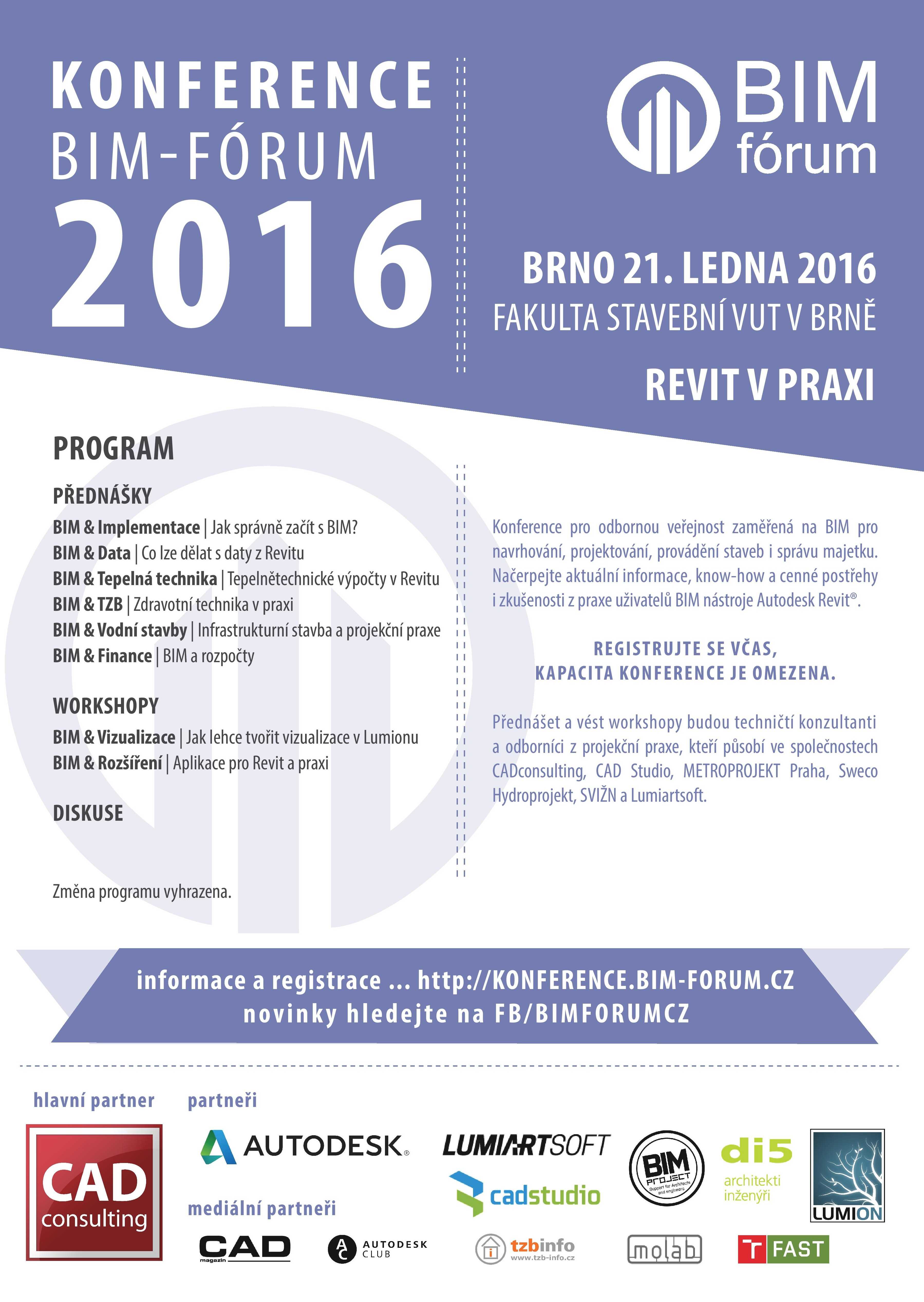 Dne 21.1.2016 bude Fakulta stavební VUT v Brně hostit již čtvrtý ročník konference BIM-Fórum. Letos se program zaměří na implementaci BIM SW pro projektování stavební části nebo TZB profesí, doplnění pro FM a možnosti rozpočtování. Nebudou chybět ani úspěšně zvládnuté projekty a doporučení pro firmy