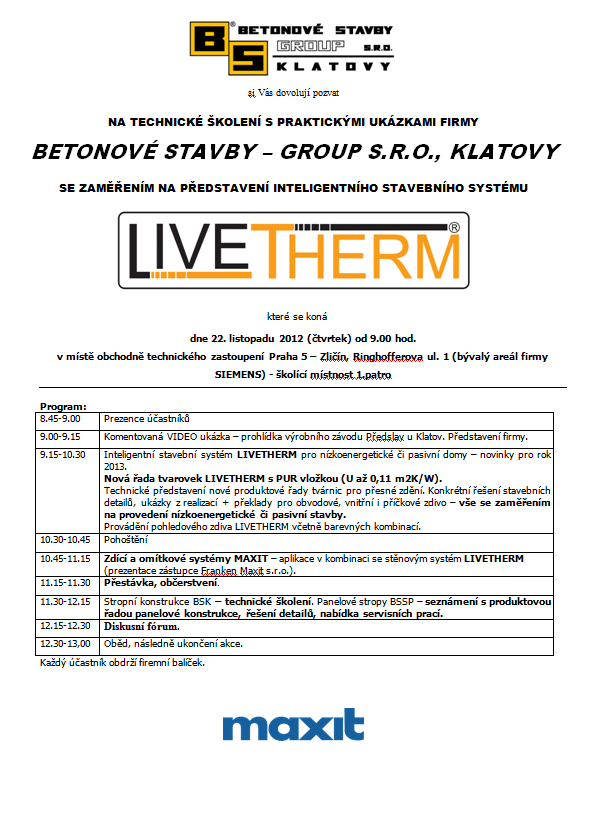 Tématém školení je prezentace novinek v rámci systému LIVETHERM, připravena je též prezentace firmy Franken Maxit s.r.o.