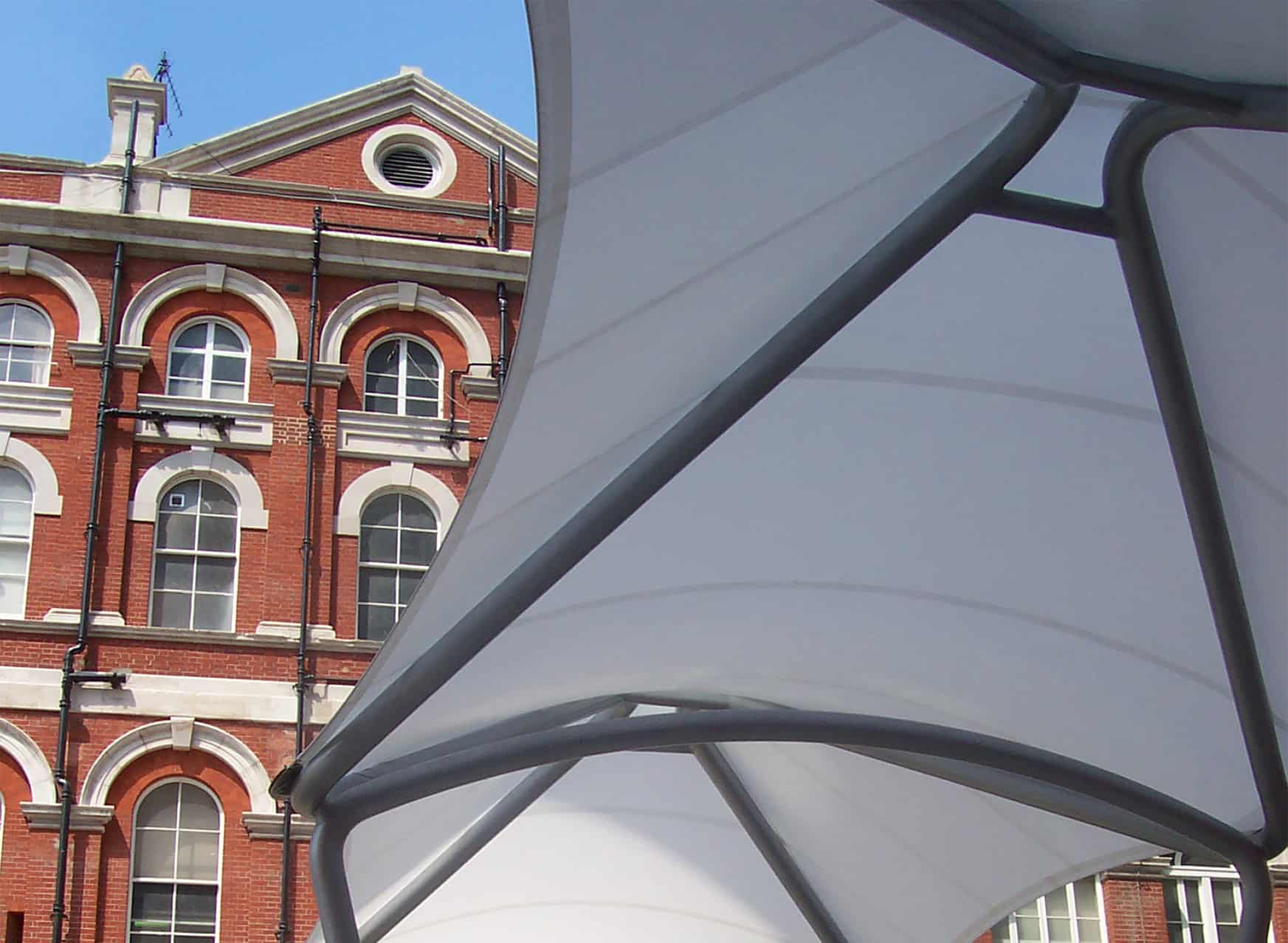 Přípoj membrány k obloukům je patrný z obr. 2. K vnějšímu oblouku je uchycena pomocí hliníkové upínací lišty s keder profilem, k vnitřnímu oblouku byly membrány navlečeny prostřednictvím vystříhaných kapes. Volný obvod membrány byl vyztužen ocelovými lanky ø 6 mm (7×7 lanka CarlStahl) protaženými kapsami membrán a ukončenými nalisovanými závitovými koncovkami. Předpětí membrán bylo dosaženo v ukotvení na nerezových platlích utahováním matic koncovek, částečně i mezi oblouky napínacími šrouby.