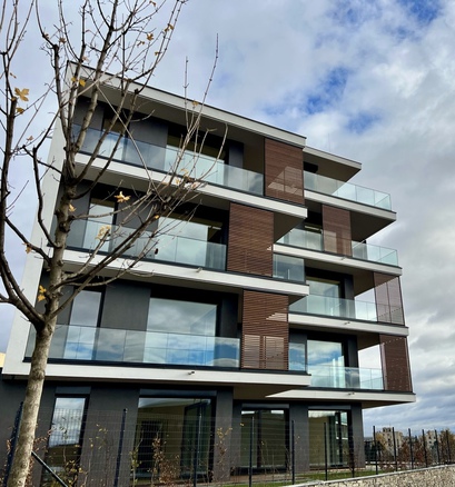 Lodžie se skleněným zábradlím jsou doplněny posuvnými stínicími panely VOÏVO s lamelami z modřínového dřeva. Tyto panely umožňují flexibilní regulaci světla i soukromí a zároveň vytvářejí jemnou hru světla a stínu na fasádě.
