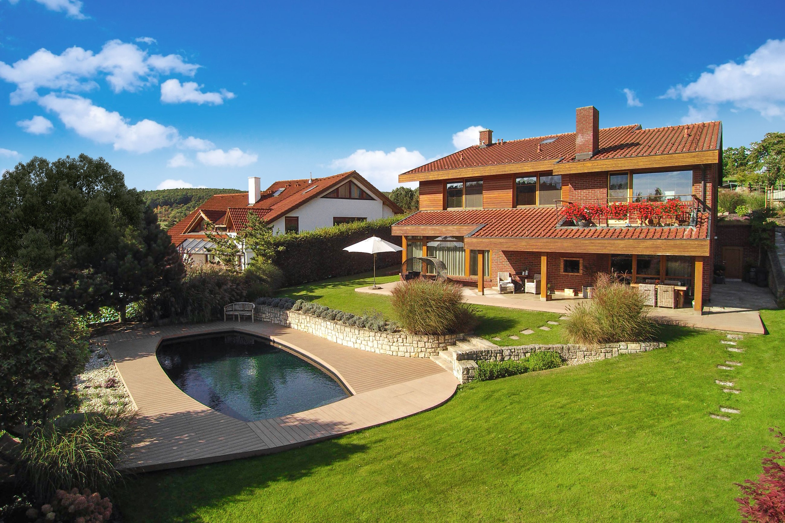 Při bližším pohledu je zřejmé, že neobvyklý tvar vodní plochy, která je navíc situována do mírného svahu zahrady, byl pro návrh i samotnou realizaci zajímavou výzvou. Právě detaily instalace nejlépe prozradí mimořádnou kvalitu prken Terafest®.