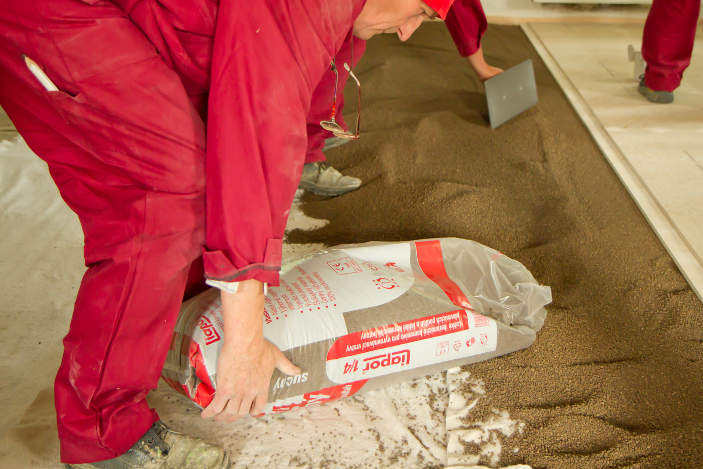 1. Použití správného podsypu: Pro vyrovnávací podsyp suchých plovoucích podlah se používá výhradně nejjemnější frakce keramického kameniva Liapor, s velikostí zrn 1–4 mm. Minimální výška vrstvy Liaporu je 20 mm.