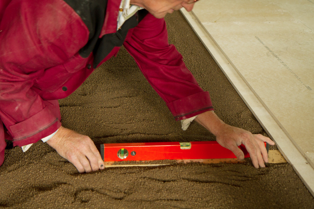 4. Urovnání a hutnění: Liapor se urovnává a hutní ručně, pomocí hliníkových stahovacích latí, hladítek a vodováhy. Správné zhutnění se kontroluje tak, že se na vrstvu kameniva položí odřezek podlahové desky o velikosti přibližně 50 × 50 cm. Pokud si na desku stoupne statný dospělý člověk, deska by se neměla pod ním hýbat.