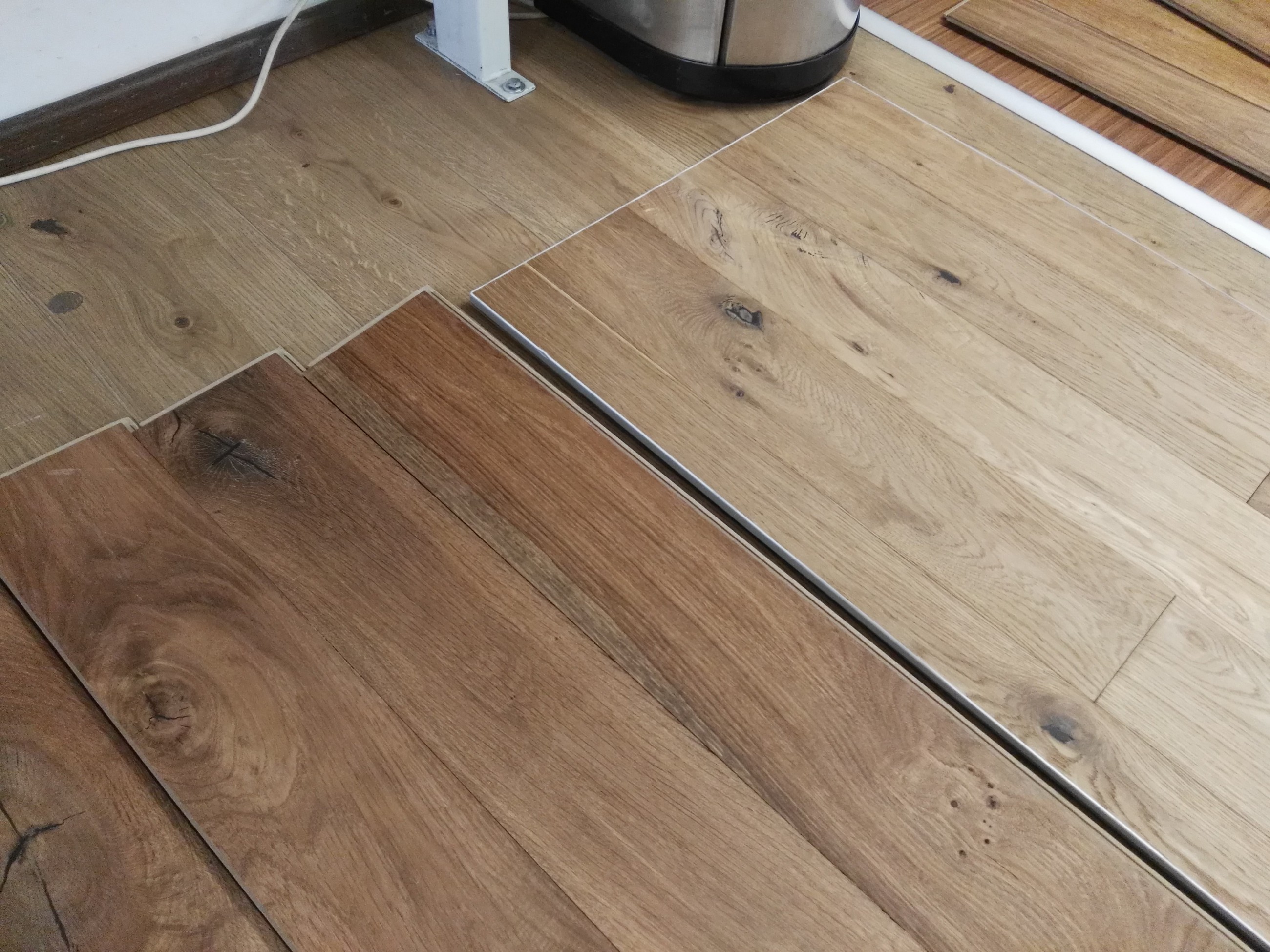 • Odlišná barva krytiny oproti vzorku – tento jev je asi nejnepříjemnější a to jak z pohledu koncového uživatele, tak z pohledu prodejce. Může přinést i vážný spor a to v lepším případě před instalací, v horším případě po instalaci krytiny. Ke změně barvy dřeva, zcela logicky, nedochází jen na samotné krytině, ale i na vzorcích, které mají podlahářská studia vystaveny na svých vzorkovnách. A tak, je-li vzorek staršího data výroby, barva instalované krytiny nemusí vůbec odpovídat zvolenému vzorku. Jde těmto sporům zabránit? Automaticky se naskýtá odpověď, že jediným řešením je mít stále aktuální (tedy nové) vzorky = řešení sice ideální, ale nežijeme v ideálním světě. Finanční (ale i logistické) náklady na neustálou obměnu vzorků (v některých vzorkovnách by tato obměna musela probíhat i dvakrát do roka) by byly enormní a v praxi je toto řešení neproveditelné. Jedinou možností tak zůstává dokonalé vysvětlení problematiky prodejcem koncovému uživateli, ideálně i s ukázkou fotografií vybraného dekoru v porovnání s fyzickým vzorkem. Na realitu barevných změn krytiny odkazují většinou výrobci i ve svých propagačních materiálech či přímo na vzorcích.