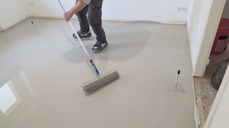 Stěrku vyléváme od nejvzdálenější části místnosti směrem ke dveřím. Materiál se sám rozlévá a vytváří rovinu. První vrstva slouží k vyrovnání největších nerovností a vytvoření pevného základu. Pomocí podlahářského ježka odstraníme vzduchové bubliny, aby byla vrstva kompaktní a bez vad. Po vytvrdnutí první vrstvy následuje opětovná penetrace, která zajistí správné propojení s další vrstvou.