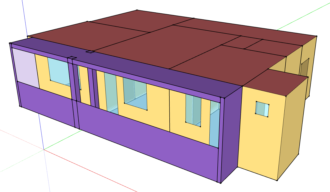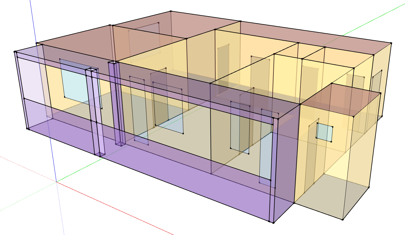 Samotný výpočtový model bytu je znázornený na obr. 1. Je vytvorený v grafickom software SKETCHUP 8.0 [2], na základe podkladov z dostupnej projektovej dokumentácie BD. Samotný byt tak tvorí cca štvrtinu pôdorysu typického podlažia a ten tak obsahuje zrkadlovo (v oboch smeroch) úplne identický byt, čiže v ich celkovom počte sú ich na jednom podlaží celkom 4. Celým svojim stropom, podlahou ako aj väčšinou priečok sa tak dotýka ďalšieho z identických bytov, čo tvorí podstatu, základ celej ďalšej výpočtovej simulačnej analýzy, porovnania.