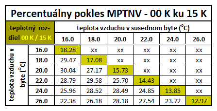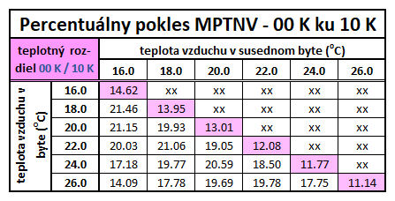 Tabuľka 3a a 3b prezentuje vzájomný pokles MPTNV tepelne neizolovaných konštrukcií voči ich izolovaniu kritériom normy STN – do 10 K a do 15 K. Priemerný pokles menšieho kritéria dosahuje 17,6 %, vyššieho 24,1 %. Hodnoty vpravo od diagonály sú matematicky žiaľ nekvantifikovateľné. Reálne hodnoty môžu byť ďalej výrazne ovplyvnené spôsobom vetrania bytu, ako aj skutočnými vnútornými tepelnými ziskami. V oboch prípadoch boli v analýze definované, ako už bolo uvedené vyššie, v zmysle aktuálnej platnej legislatívy stanovenia MPTNV.