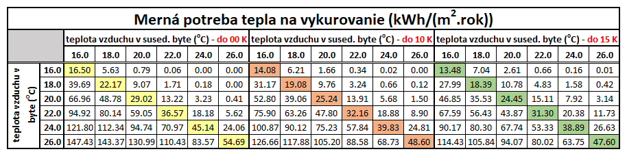Tabuľka 1 interpretuje hodnoty mernej potreby tepla na vykurovanie (ďalej aj ako MPTNV) pre všetky varianty tepelného izolovania deliacich konštrukcií v súčinnosti so všetkými kombináciami výpočtových teplôt hodnotiaceho bytu i bytov susediacich. Pozdĺž línie rovnakých teplôt vzduchu dosahuje hodnoty od 13,5 do 54,7 kWh/(m2.rok). Tieto hodnoty klesajú takmer k nule, v prípade, že je teplota vzduchu v susednom byte vyššia o 6 až 10 K, naopak dosahujú mimoriadne vysoké hodnoty, hranične až 147,43 kWh/(m2.rok), v prípade, že by susedný byt mal veľmi nízku teplotu vzduchu, len +16,0 °C (počas celej vykurovacej sezóny). Z tohto porovnania tak je zrejmé, že dochádza k nárastu týchto hodnôt, pri poklese tepelného izolovania deliacich konštrukcií o cca 11,1 až 21,5 % (porovnanie – do 00 K ku do 10 K), respektíve 13,0 až 30,0 % (porovnanie – do 00 K ku do 15 K) – tabuľka 3a.