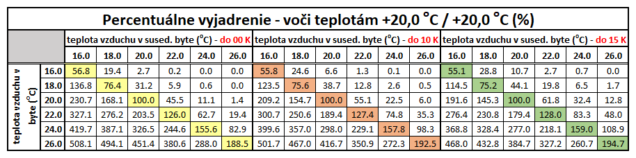 Tabuľka 2 následne dokumentuje všetky nárasty a poklesy mernej potreby tepla na vykurovanie vztiahnuté ku štandardizovanej vnútornej teplote vzduchu obytných budov +20,0 °C, a pri jej zároveň ustálení sa aj vo všetkých susedných bytoch. Podobne ako v tabuľke 1, i tu je, v percentuálnom vyjadrení, rozptyl MPTNV mimoriadne vysoký a klesá až hodnote 0,0 % a pri extrémnej, hraničnej kombinácii teplôt +26,0 °C „náš“ byt a susedné byty +16,0 °C je naopak nárast mernej potreby tepla na vykurovanie až viac ako päťnásobný (o 408 %).